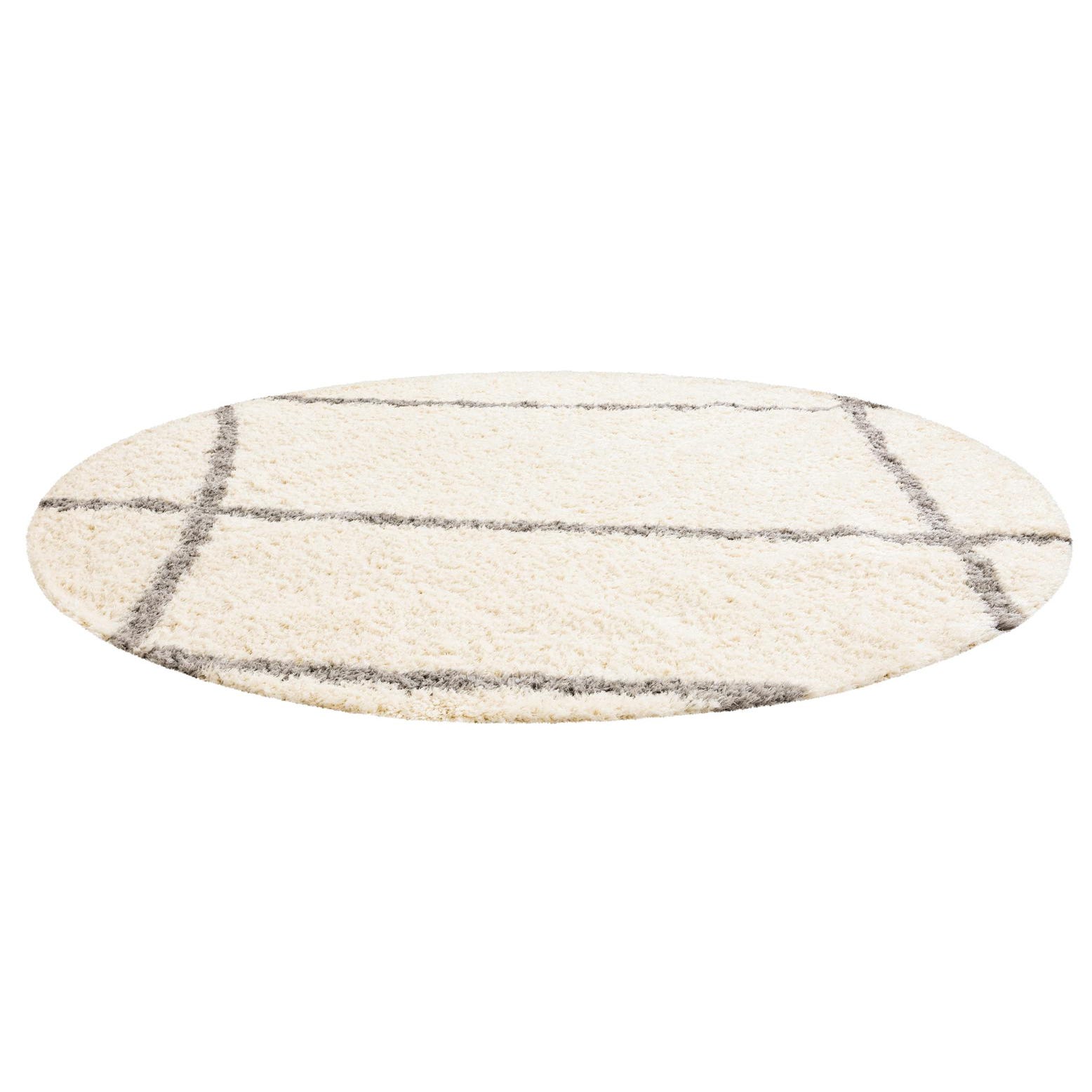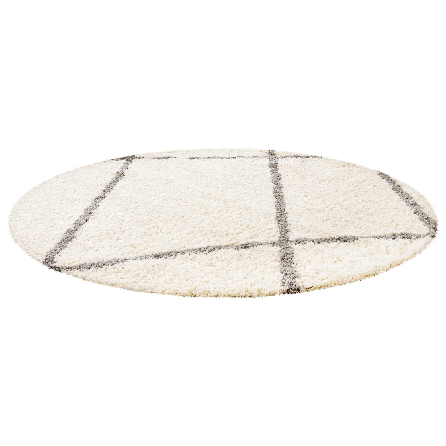 A 10-foot round shag rug with a modern gray geometric pattern on a cream background, perfect for a living room.