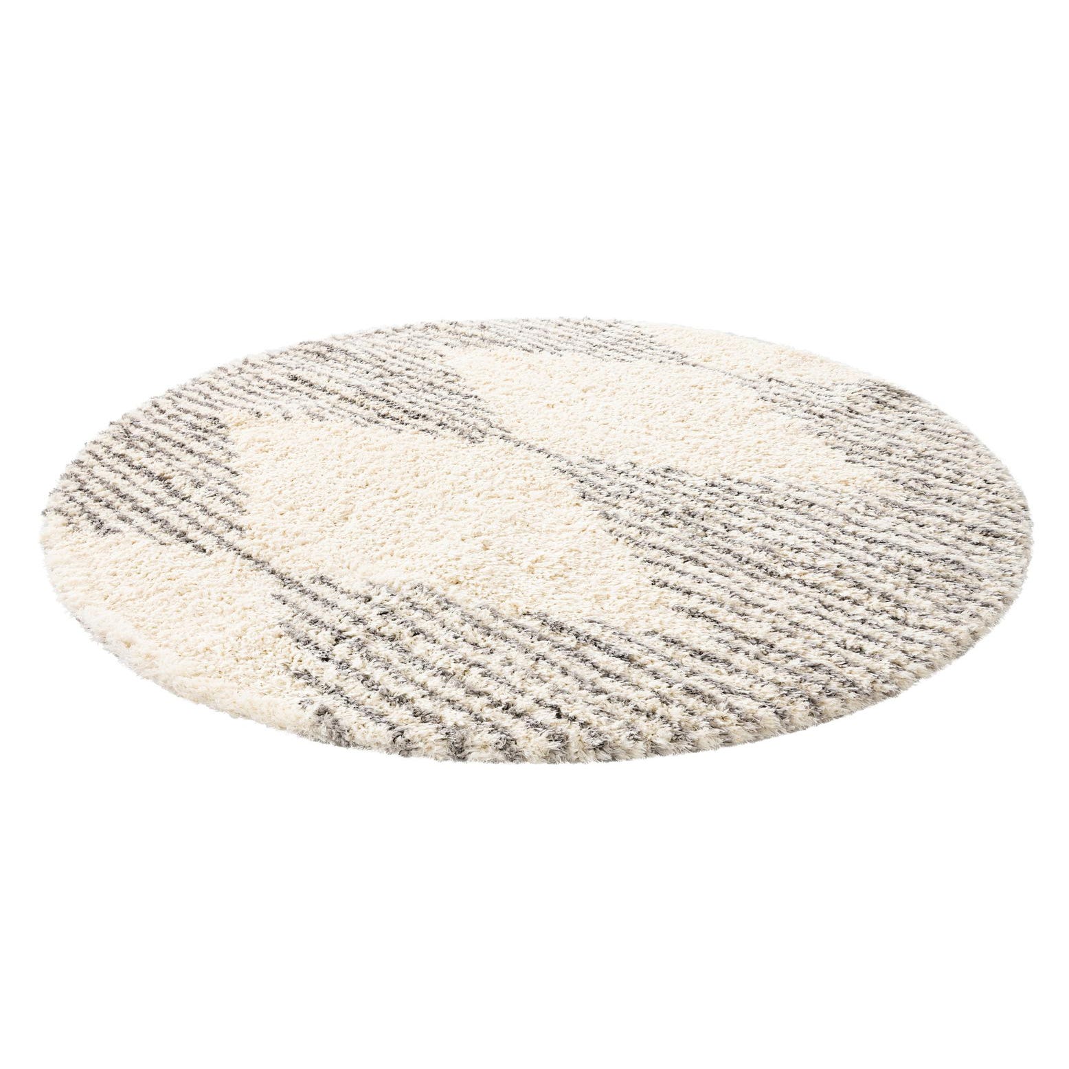 A round, gray and ivory modern shag rug with a central diamond pattern, suitable for a living room or bedroom.