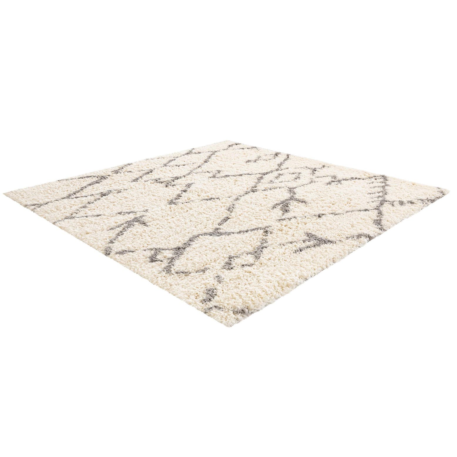 A square 8'x8' Rugs.com Infinity Shag rug with a plush cream pile and modern gray geometric lines.