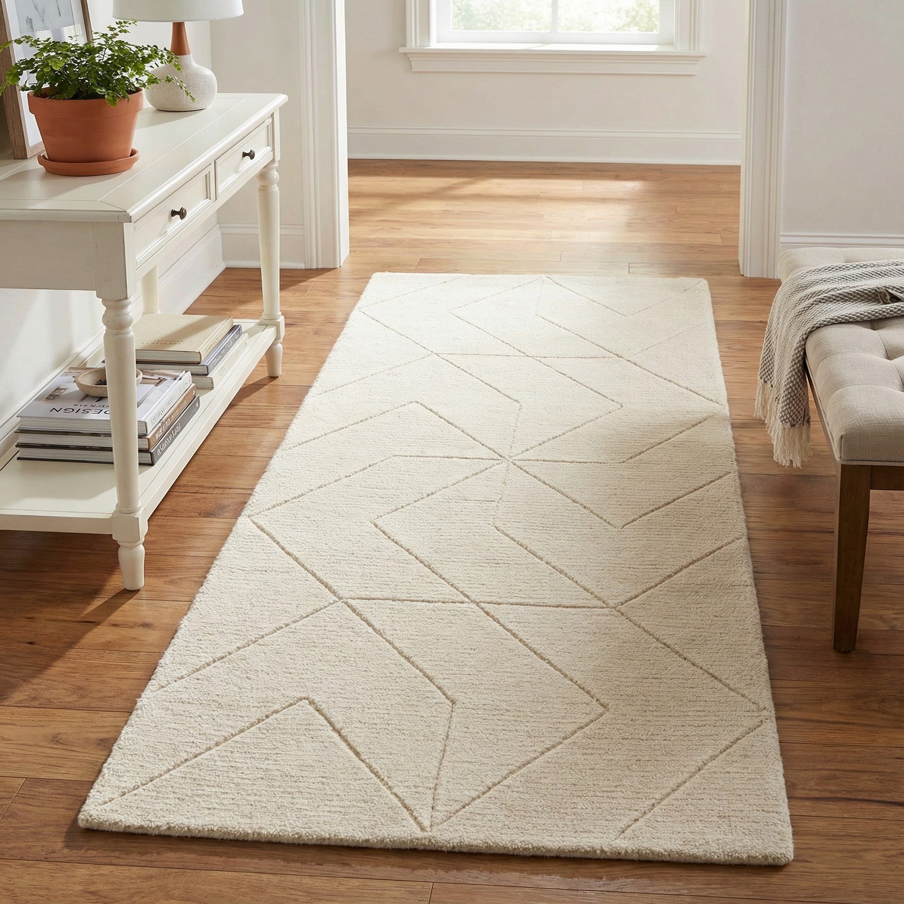 A 5 ft ivory runner rug with a modern geometric stripe pattern, perfect for a hallway.