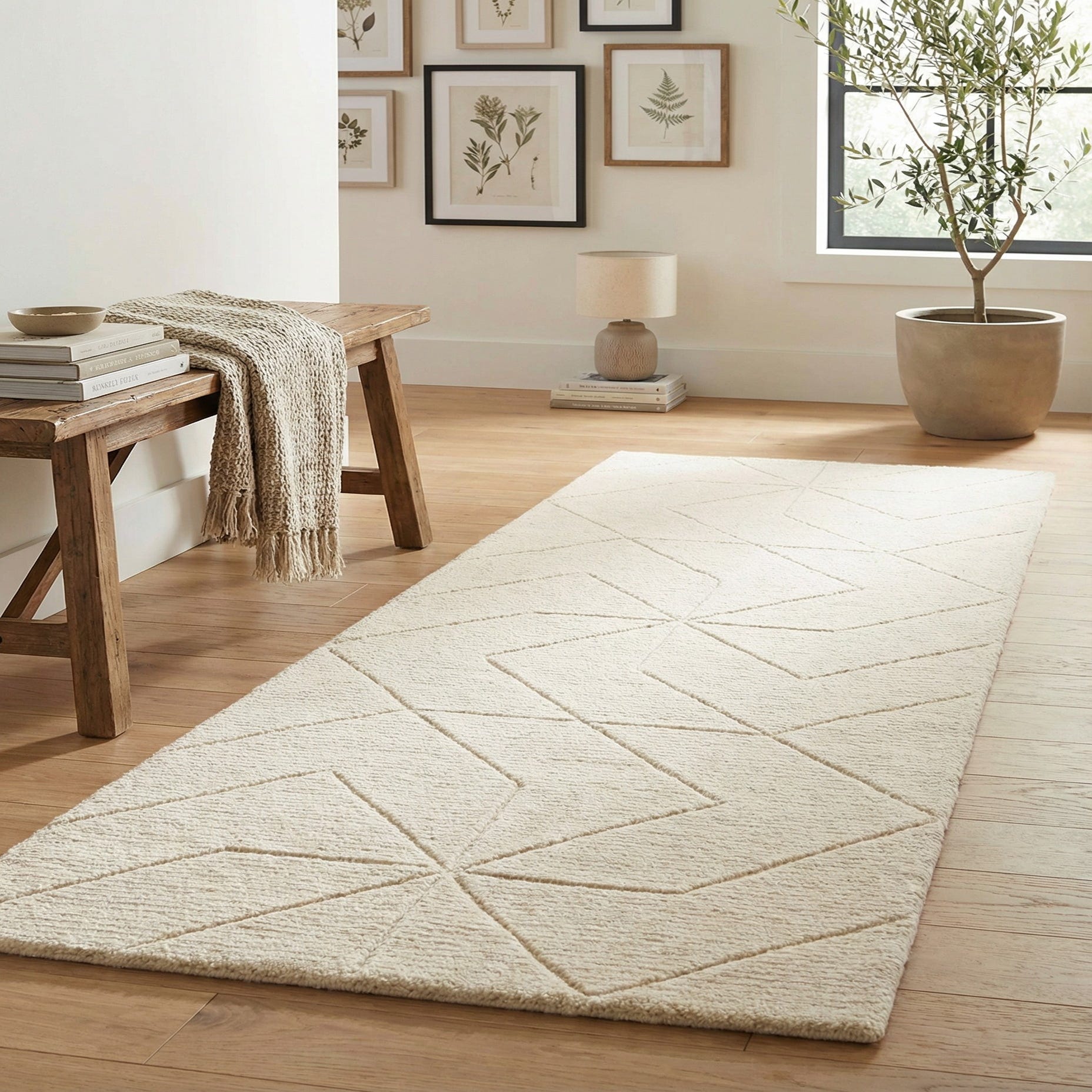 A 6 ft ivory runner rug with a modern geometric stripe pattern, featuring a textured, high pile.