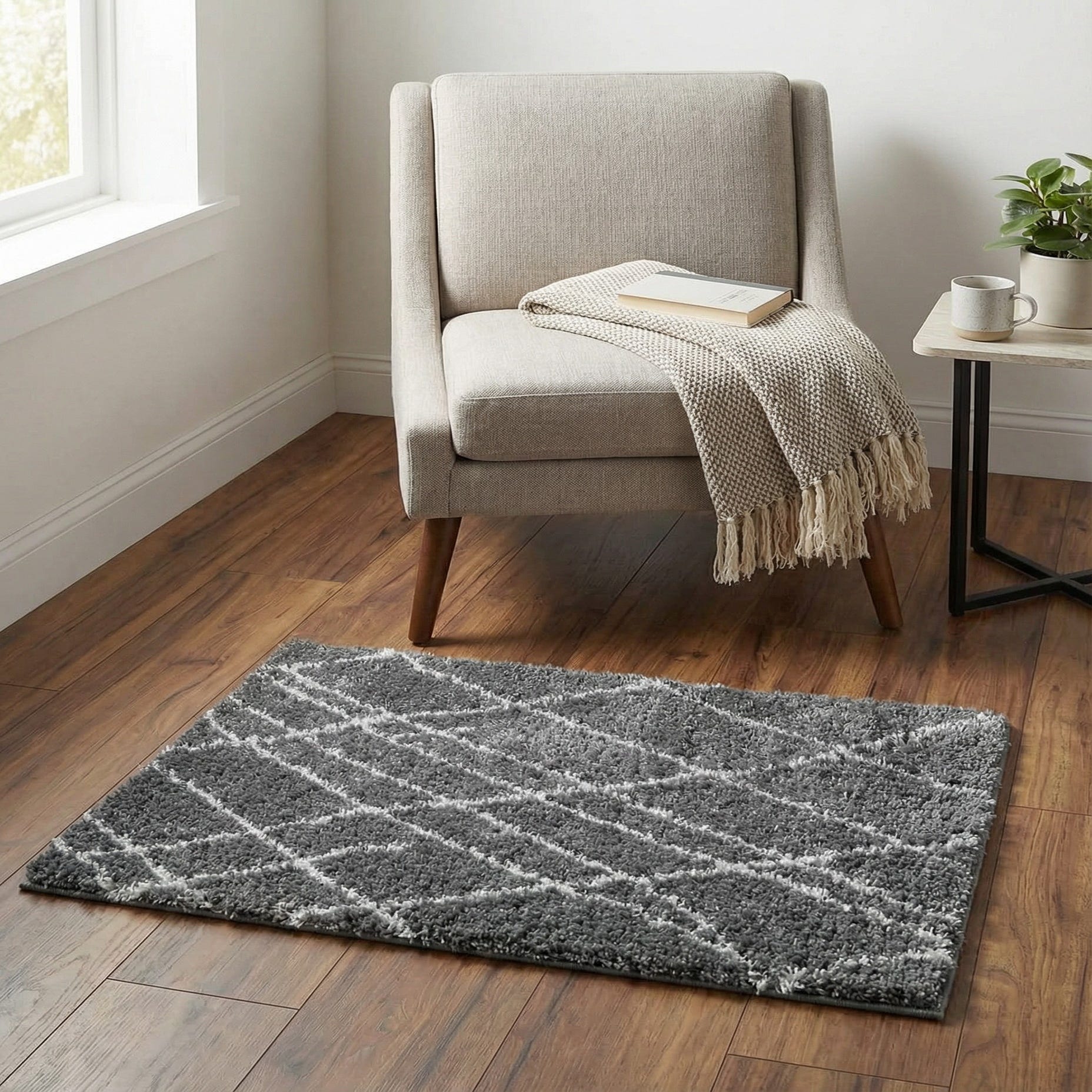 A plush, high-pile shag in machine-made 100% polypropylene, this rug pairs a pebble gray field with an ivory diamond trellis for a casual geometric look. The long, dense fibers feel soft underfoot, and the ivory yarns add a subtle, tactile contrast that lifts the pattern from the muted background. Its relaxed shag profile suits contemporary and transitional styles while keeping a comfortable, lived-in texture.