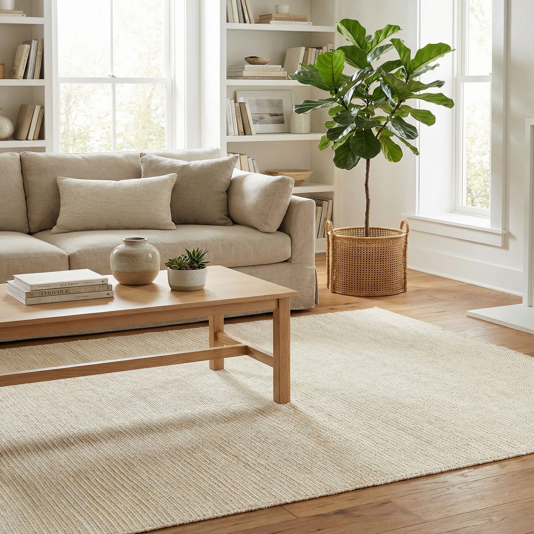 Hand made from 100% PET polyester (recycled plastic bottles), the construction feels smooth underfoot and holds a firm, flat profile that layers easily in both indoor and outdoor settings. Use it on a covered patio or balcony, beneath an outdoor dining table, or in a sunroom to extend a neutral base that complements coastal, modern-minimal, or Scandinavian-inspired decor. It also pairs well with natural wood furniture, wicker seating, and metal-framed accent pieces for a relaxed yet composed look.