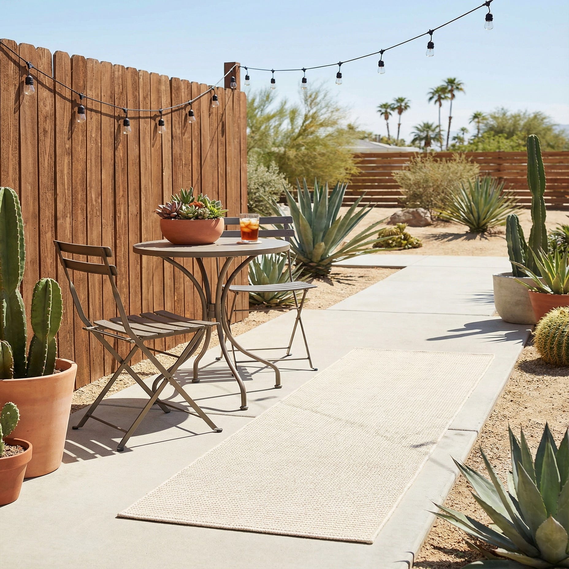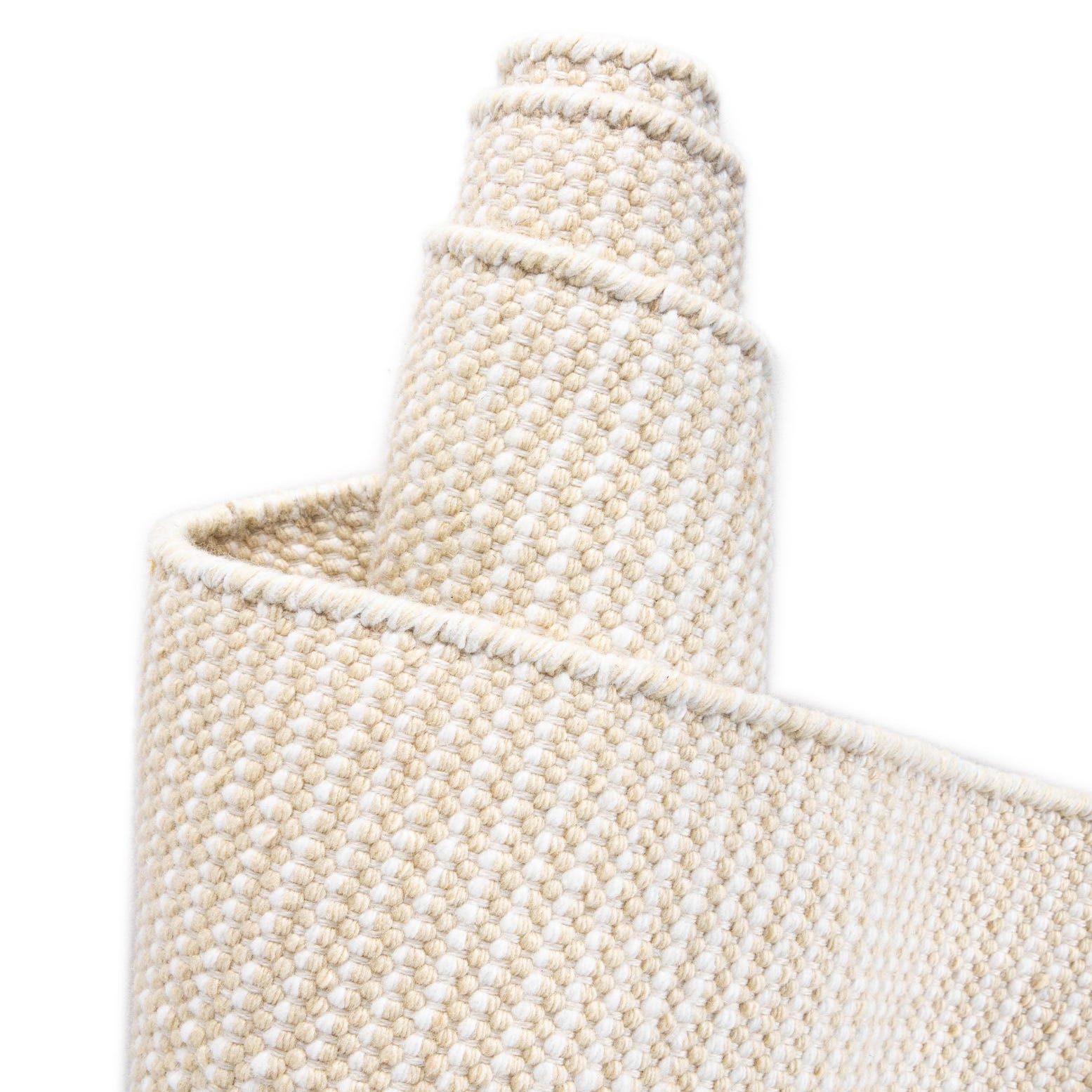 A 6 ft runner rug in a pebble stones color, featuring a textured modern flatweave pattern, suitable for indoor or outdoor use.