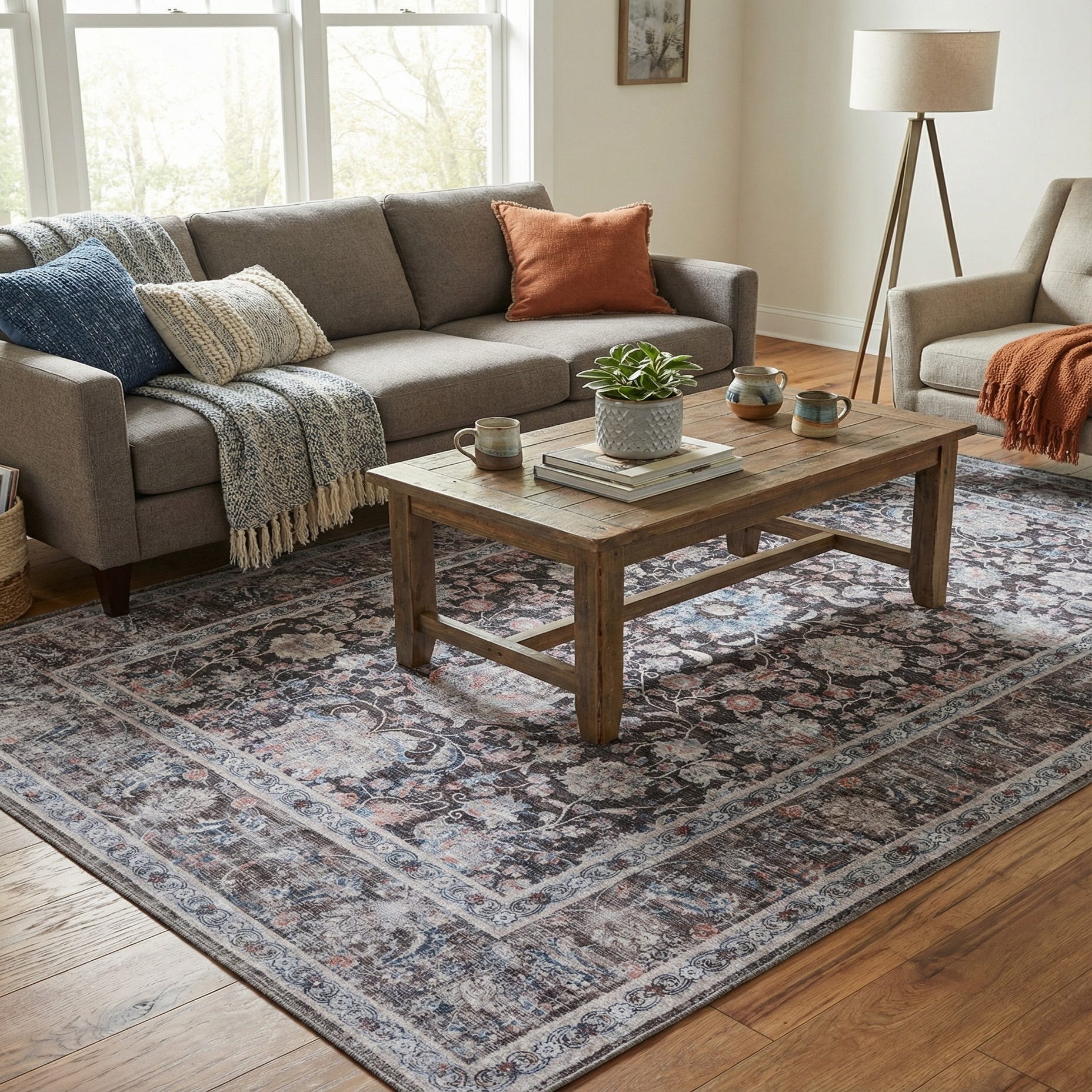 A 6x9 rectangular Pecan Brown area rug with a distressed traditional floral pattern and light border.