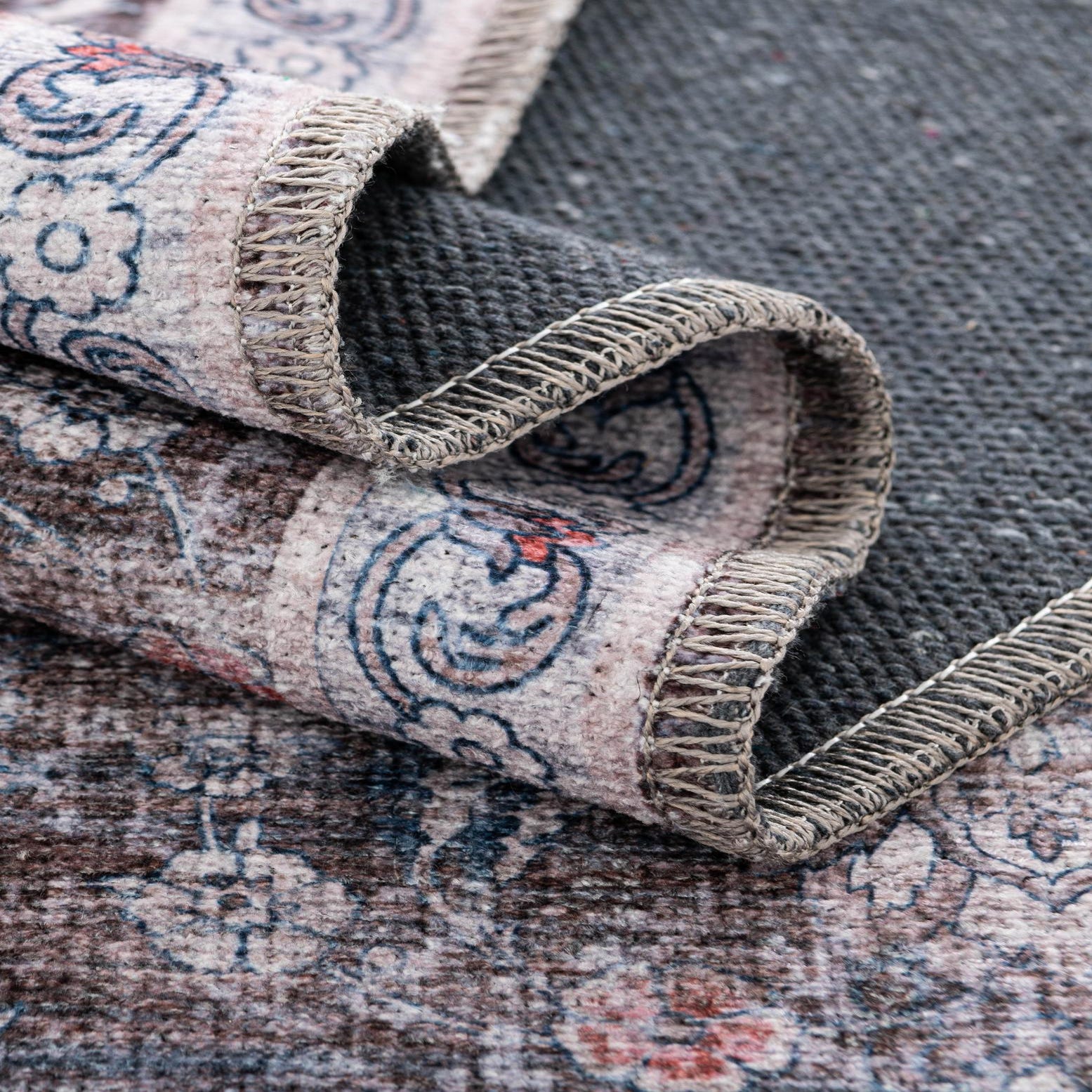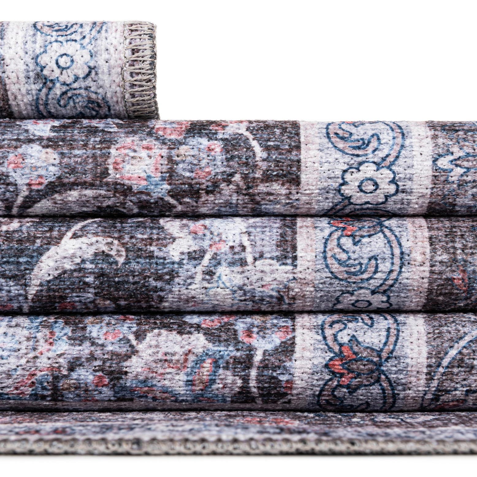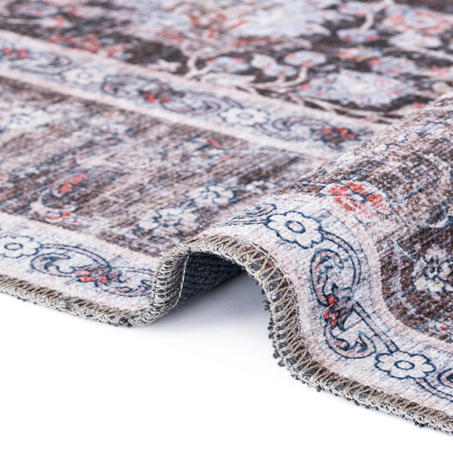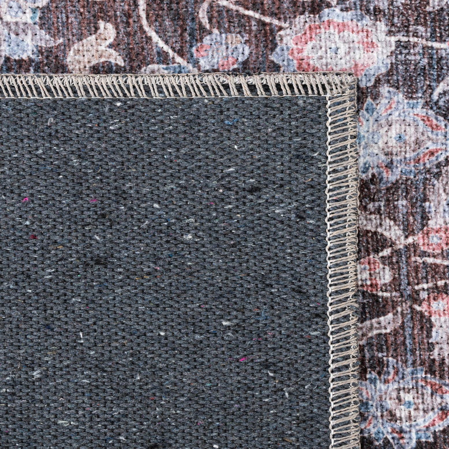 A warm pecan brown field sets the stage for an heirloom-inspired floral pattern in this machine-made rug. A central medallion and scrolling vine motifs unfold across the surface, with ivory and beige highlights tracing the blooms and foliage. Blue and navy accents add cool contrast, while small touches of red bring a subtle, antique flair. A layered border frames the design and a distressed finish softens the colors for a classic, timeworn appearance.