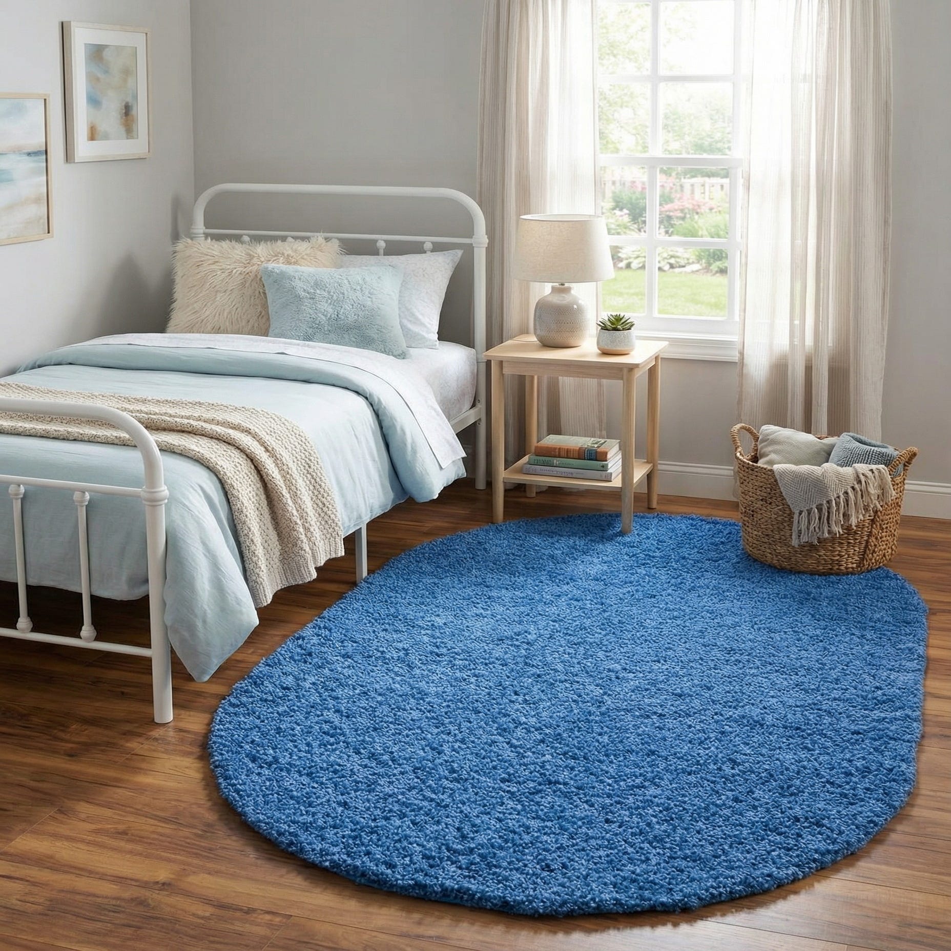 A soft, plush 3' 0 x 5' 3 oval shag rug in a vibrant blue color, perfect for adding comfort to any indoor space.