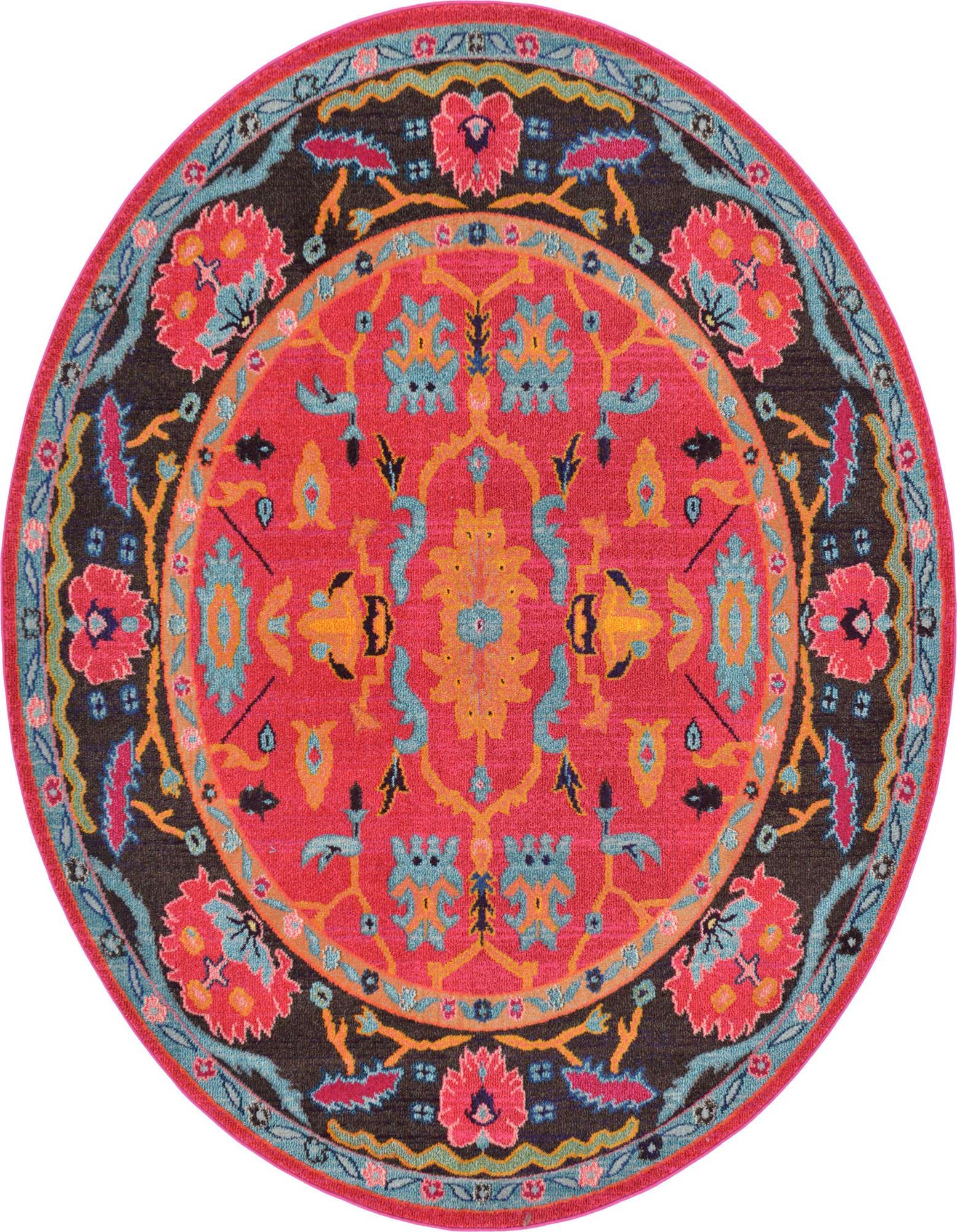 Primary color is Pink. Colors in this rug include: Pink, Beige, Brown, Light Blue, Light Green, Red, Blue, Orange, Yellow.