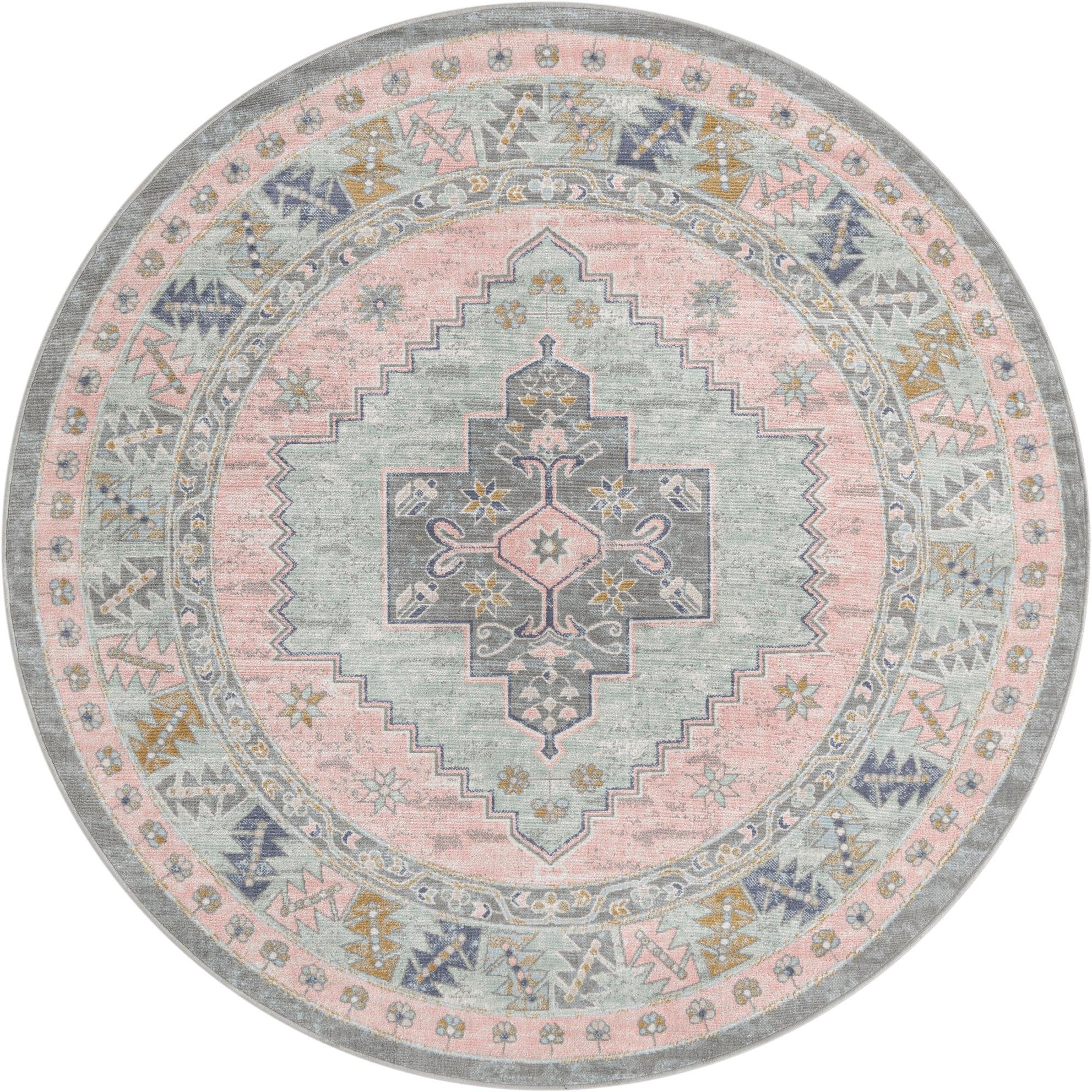 The Whitney Collection 10 Ft round rug is crafted from 100% polypropylene, ensuring a durable and stain-resistant surface suitable for various living spaces. The design features a central medallion pattern surrounded by intricate detailing and border elements. The color palette is composed of a soft pink background with complimentary shades of blue, light blue, and gray, creating a subtle yet inviting aesthetic.