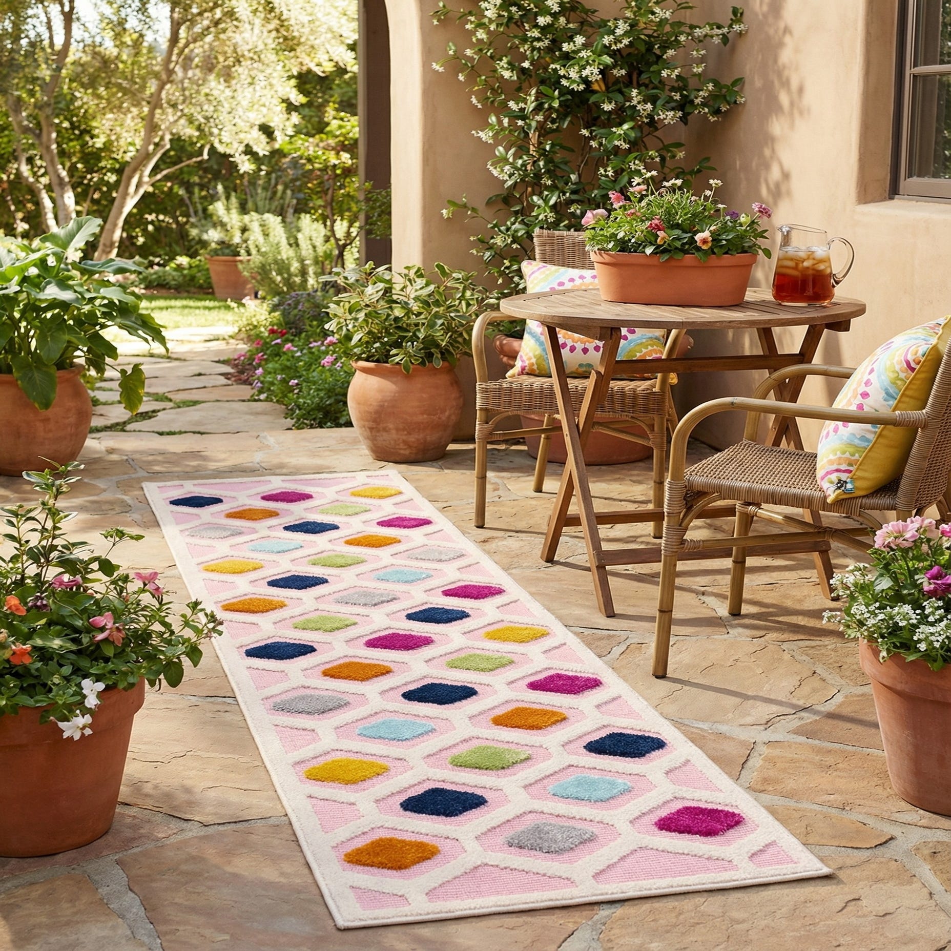A 10 ft runner rug featuring a pink background with a white trellis pattern framing colorful bohemian diamonds in blue, orange, yellow, green, gray, and fuchsia.