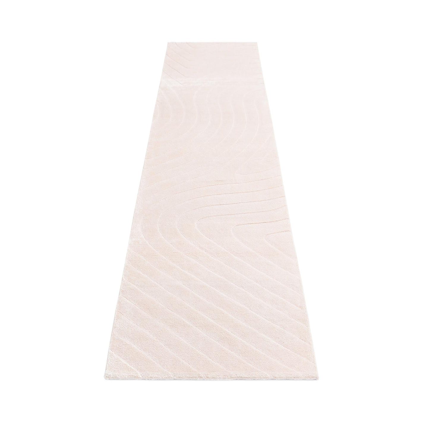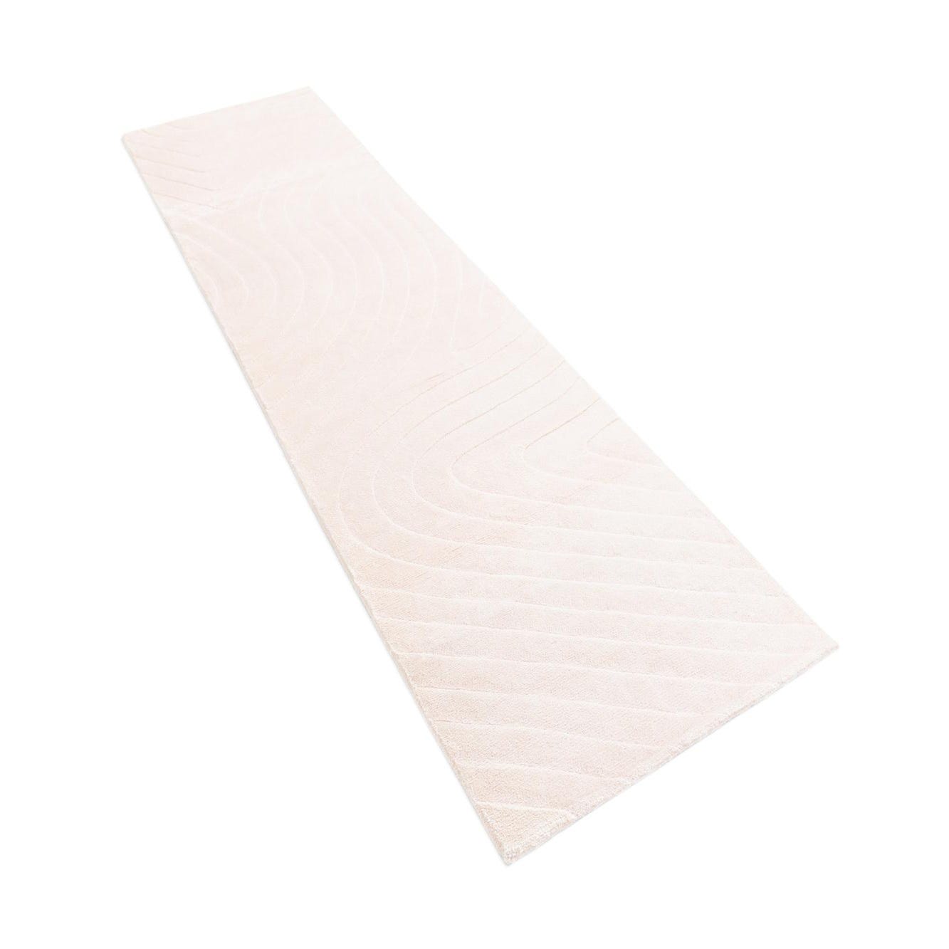 A 10 ft runner rug in soft pink with a modern Persian-inspired wavy pattern, ideal for a hallway.