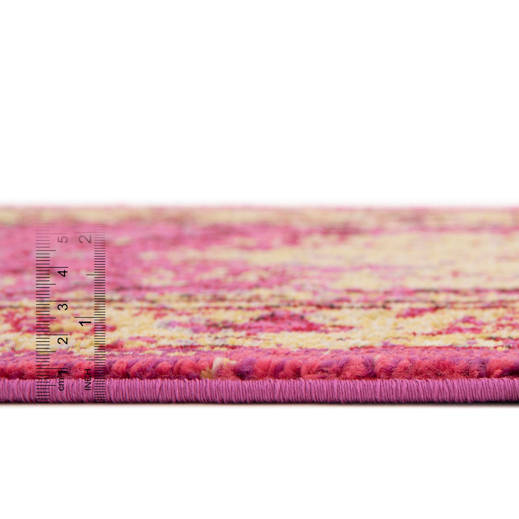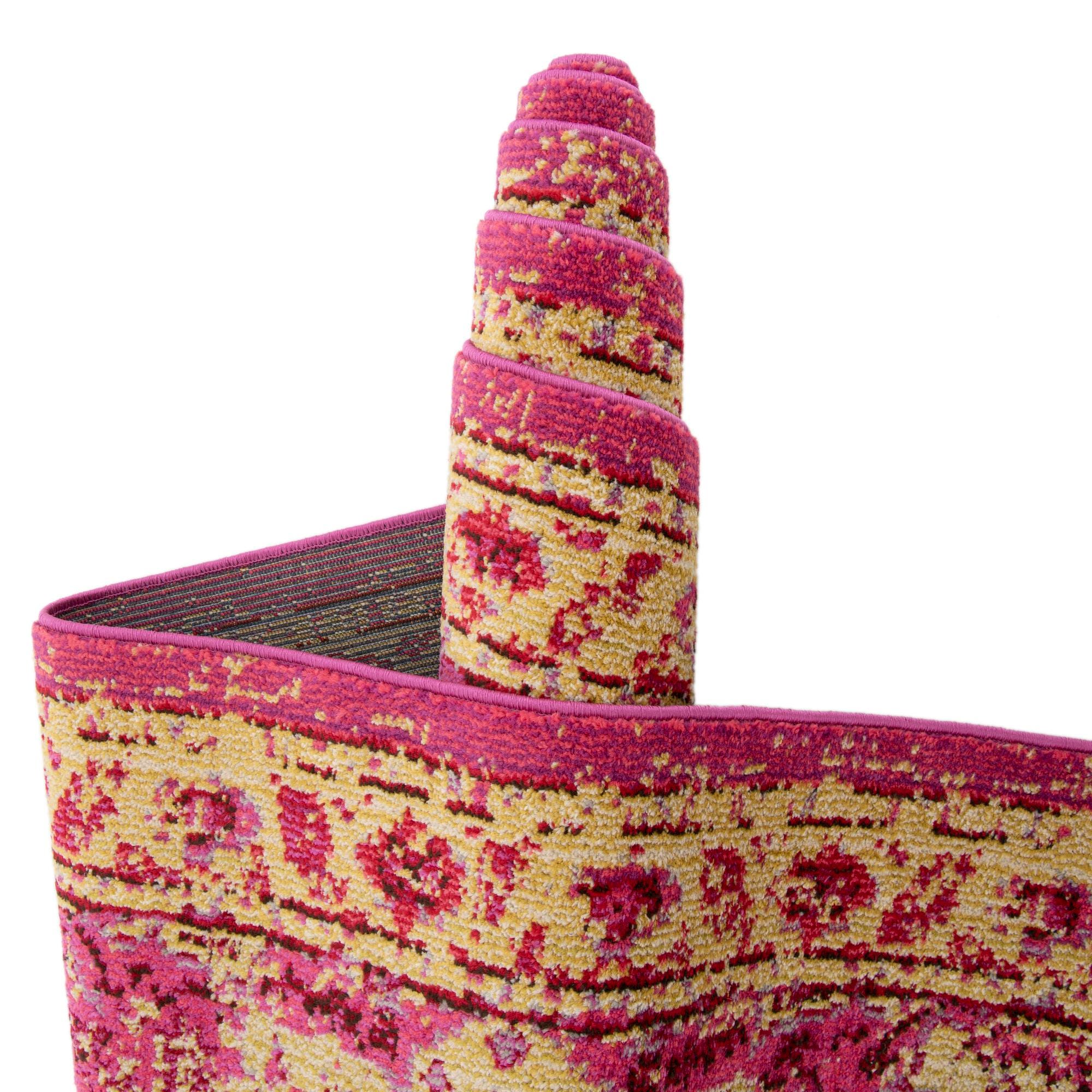A 10 ft runner rug in vibrant pinks and gold, featuring a distressed medallion and border pattern, perfect for a hallway.