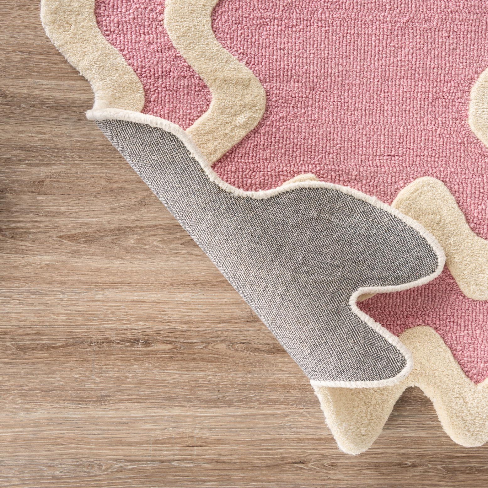 A 10 ft runner rug in pink with a cream wavy border, featuring a high, textured pile, perfect for a hallway.