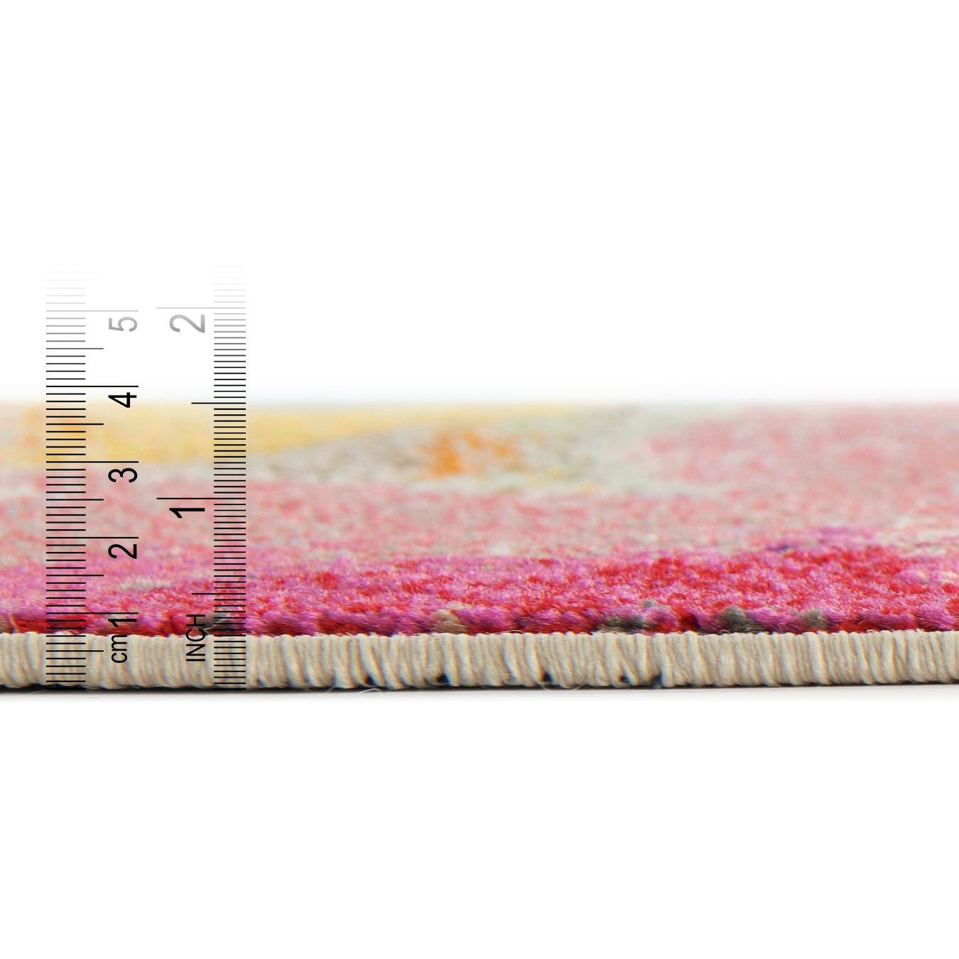 Primary color is Pink. Colors in this rug include: Pink, Green, Navy Blue, Orange, Yellow.