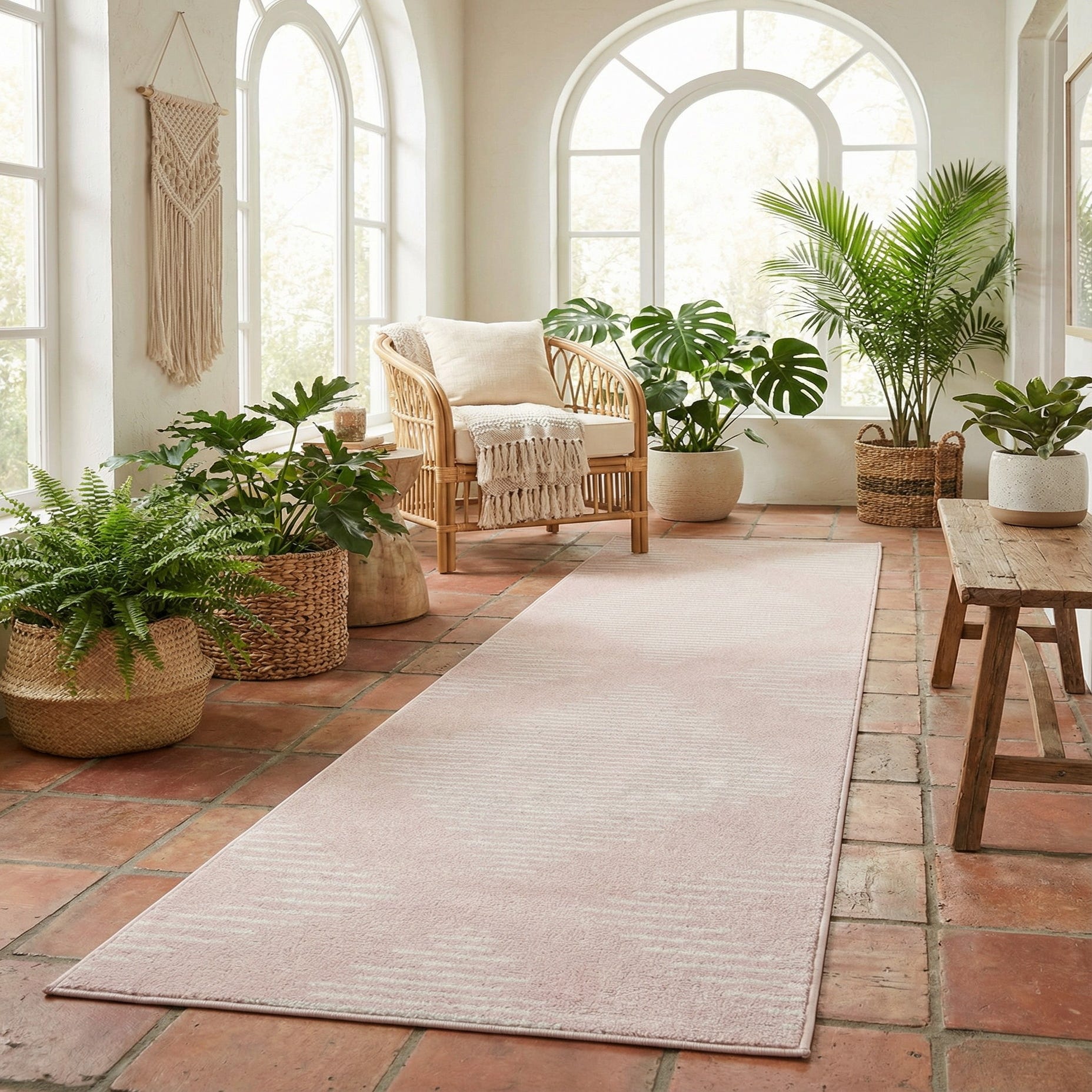 The clean geometric motif and muted palette work well in contemporary and transitional interiors. Use it as a hallway runner, to soften the path between rooms, or place it at the foot of a bed or in a dressing area to introduce a calm, feminine touch. It pairs nicely with light woods, crisp whites, and soft metallic accents, as well as pared-back Scandinavian or modern-boho furnishings.