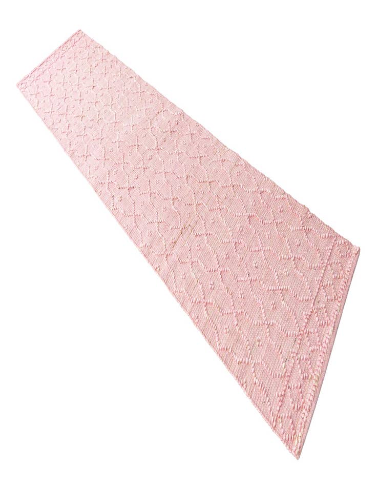 A soft pink field is patterned with a repeating geometric trellis formed by raised looped yarns and tiny knotted tufts, creating a gentle, rhythmic texture across the runner. Hand-woven from 90% cotton and 10% jute, the rug has a smooth, cotton base with subtle nubby accents where the jute and raised knots catch the light, giving low-profile dimension without adding bulk. The motif and construction balance modern geometry with a handcrafted feel, making the surface both tactile and visually calm.