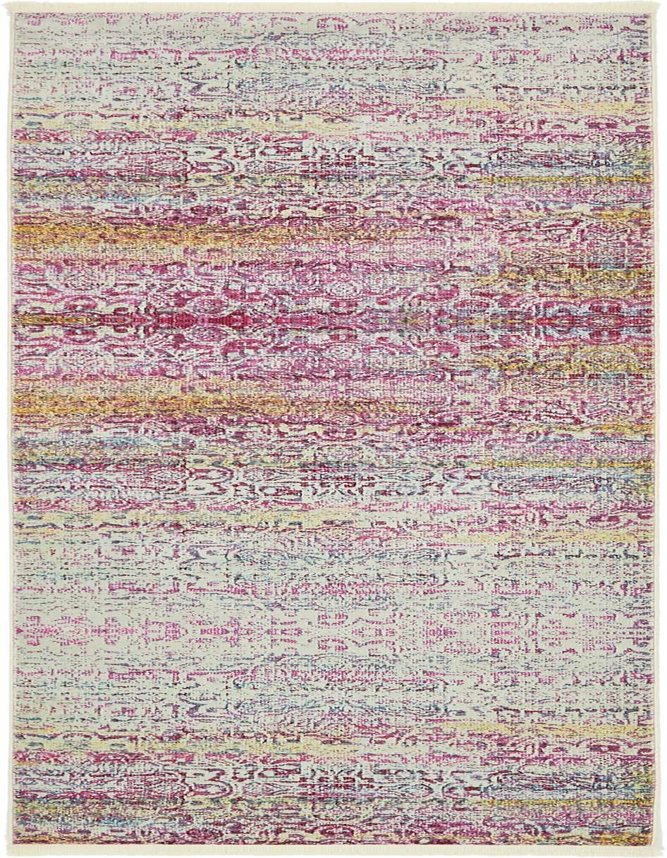 Primary color is Pink. Colors in this rug include: Pink, Blue, Red, Turquoise, Yellow, Ivory.