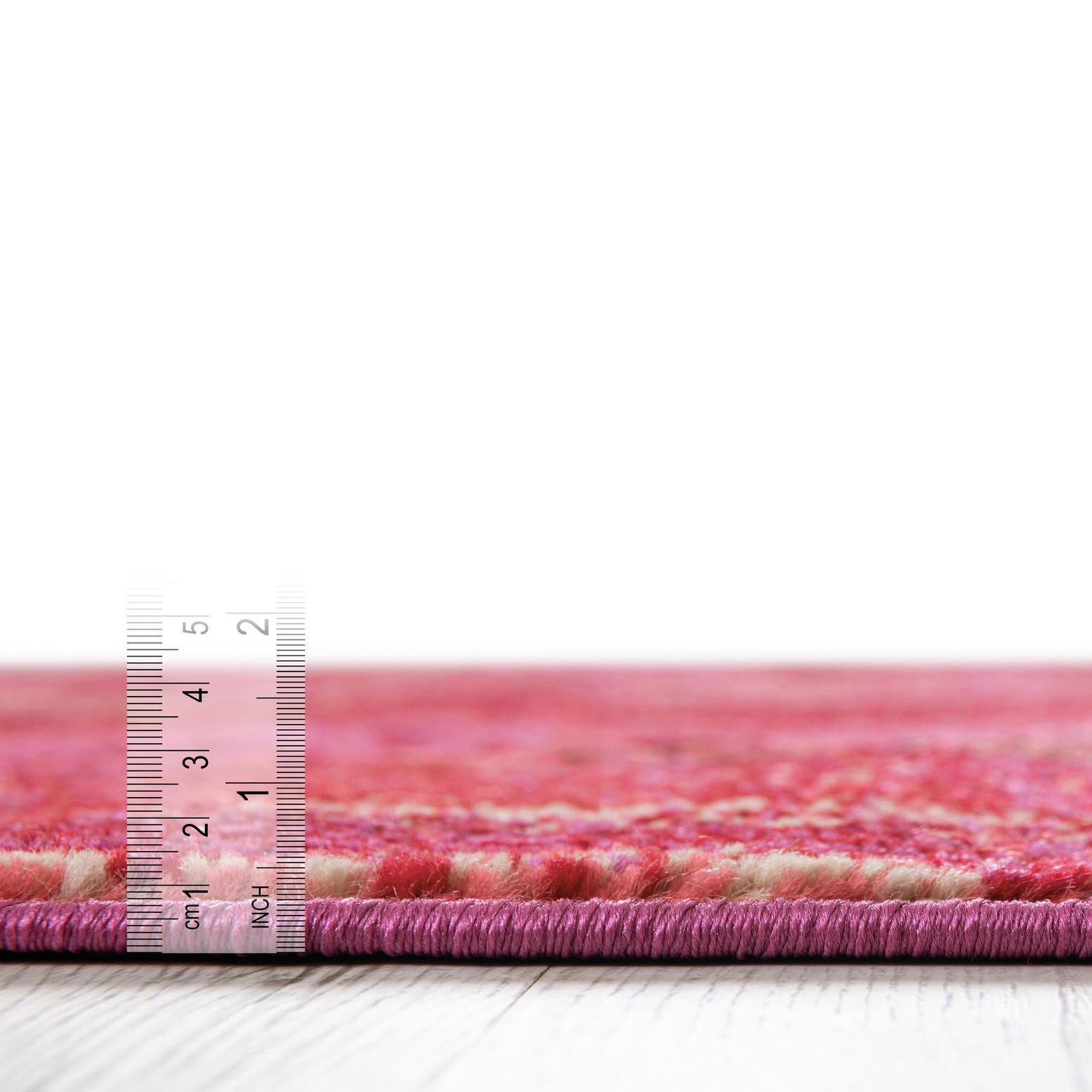 Machine-made from 100% polypropylene, the pile is low and tightly woven, offering a smooth, slightly textured hand that stays visually interesting underfoot. This runner fits well in vibrant, eclectic interiors or contemporary spaces that benefit from a bold color anchor; it also pairs nicely with neutral sofas or light wood furnishings to introduce warmth and energy. Consider it for corridors, next to a bed, or along a kitchen workspace where the rich pinks and mixed hues can tie together decorative accents like brass hardware, blush textiles, or deep wood tones.