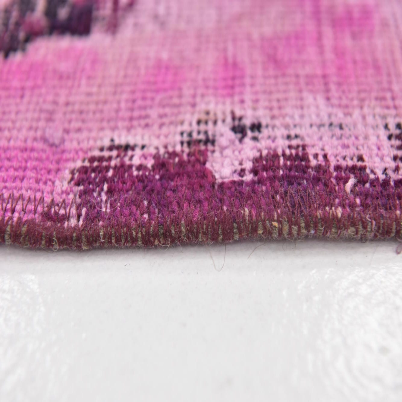 The Ultra Vintage collection presents a 10 Ft Runner, hand-knotted of 100% wool, offering a plush and durable underfoot experience. This runner features a dynamic abstract pattern, showcasing a fusion of pink, navy blue, puce, and burgundy hues, set against a dominant pink background. The textural variations and the intentional distressing of the colors give the rug an heirloom quality, echoing the aesthetic of vintage tapestries.