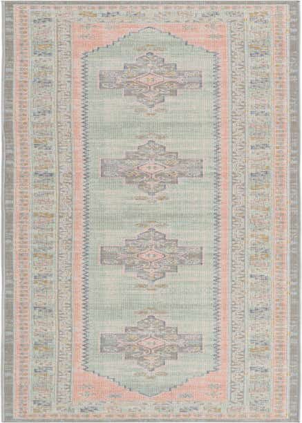 Primary color is Pink. Colors in this rug include: Pink, Blue, Gold, Gray, Light Blue, Light Green.