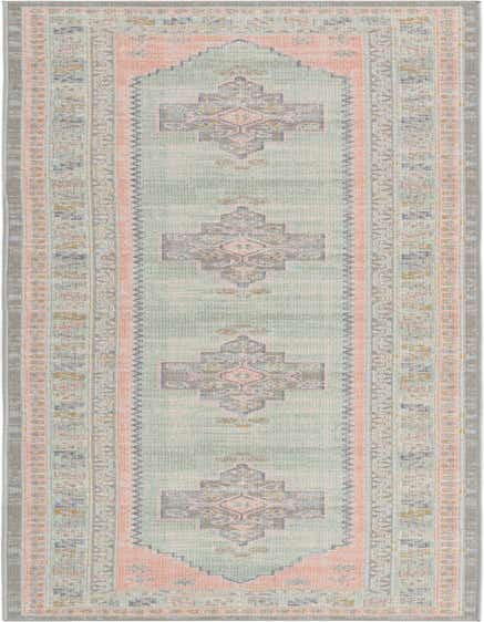 The Whitney Collection offers a 10 Ft runner rug that presents a refined take on traditional motifs, boasting a central medallion pattern highlighted by a palette of pink, blue, gold, gray, light blue, and light green. The background color of pink provides a cheerful and inviting canvas for the intricate design.
