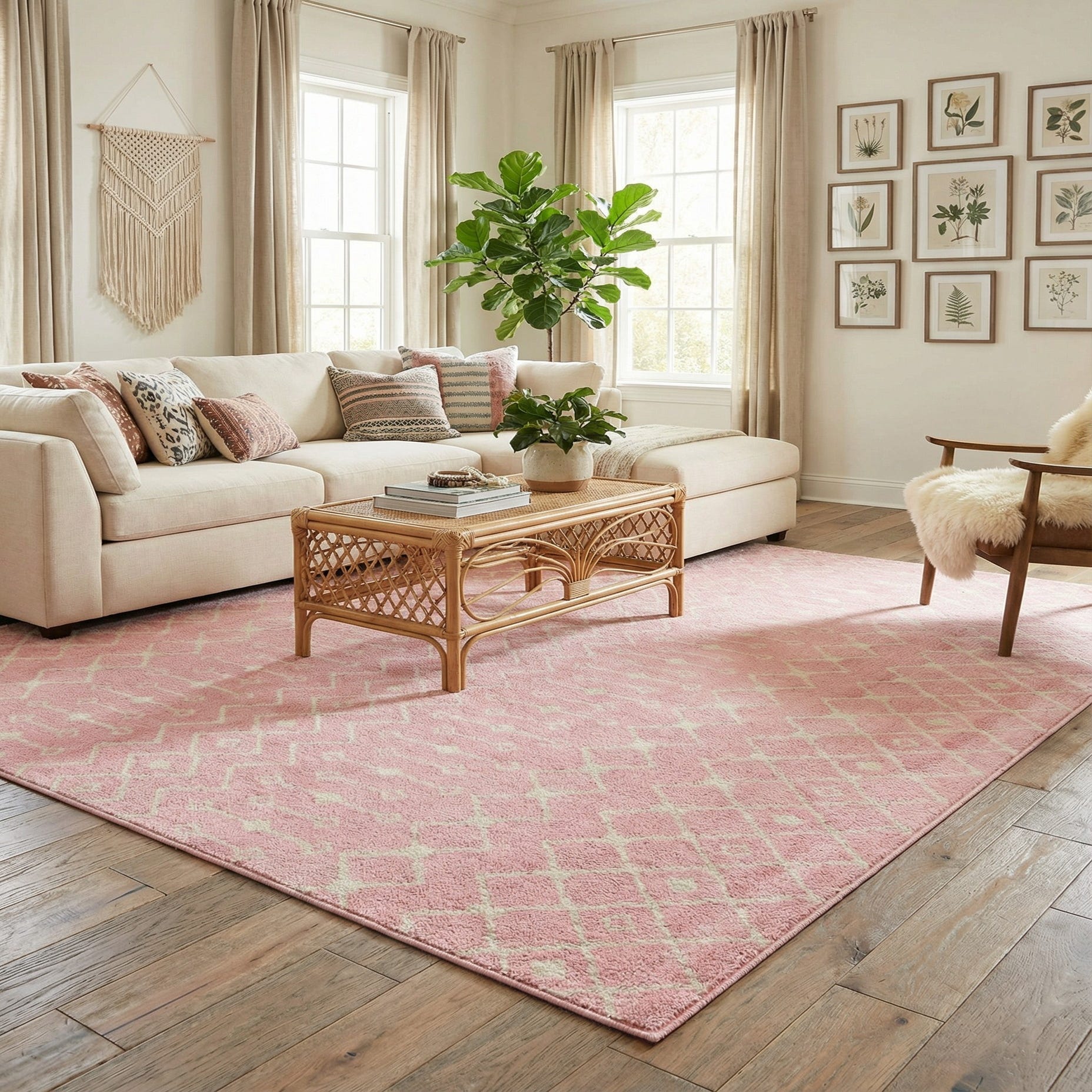 Made for everyday living, the colorway and geometry work well in a variety of interiors. Place it under a light-wood coffee table in a casual living room, layer it in a bohemian bedroom with natural textiles and brass accents, or let it bring a cheerful touch to a nursery, playroom, or home office. The pink and ivory palette pairs cleanly with white walls, soft grays, and warm metallics for a fresh, approachable look.
