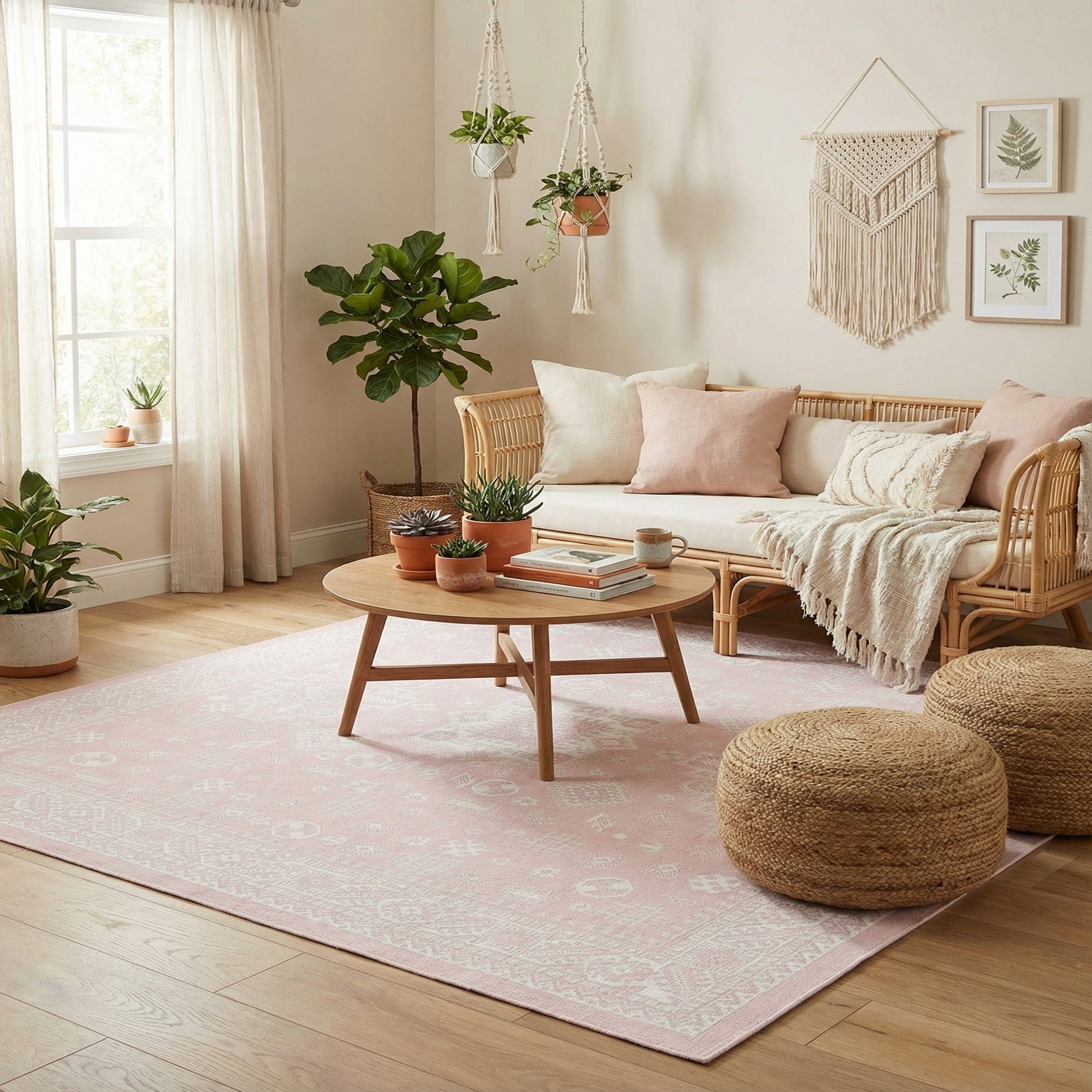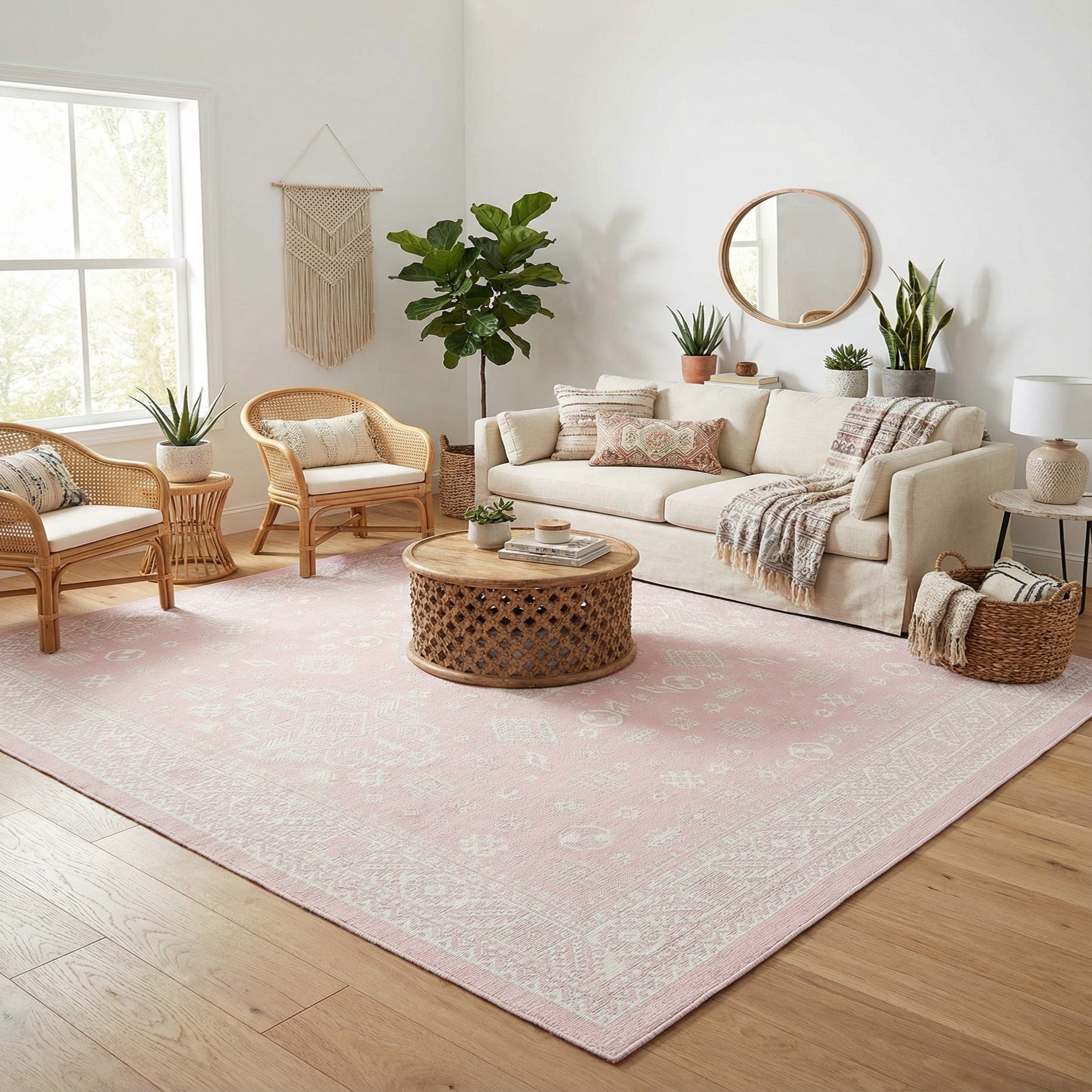 Primary color is Pink. Colors in this rug include: Pink, Ivory.