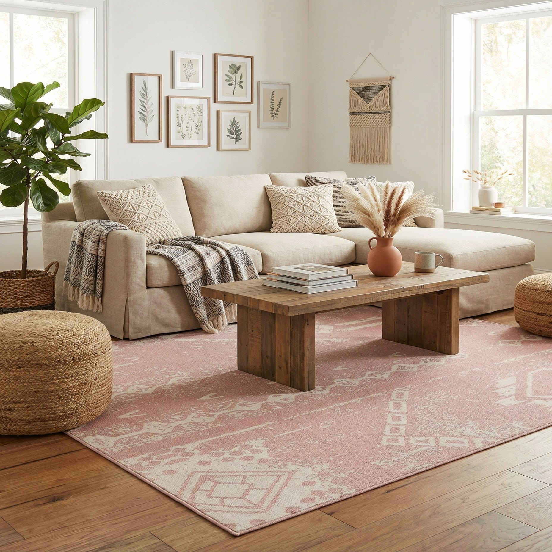 A 10x13 rectangular pink and off-white indoor/outdoor rug with a distressed traditional and bohemian pattern, suitable for a living room or patio.