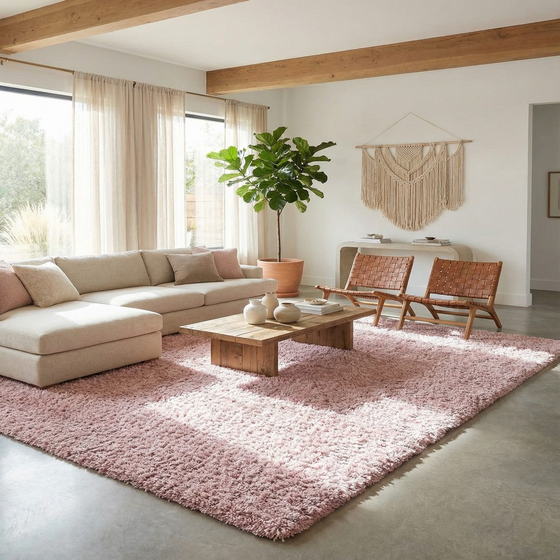 The Soft Solid Shag rug is a suitable addition to modern, Scandinavian, or minimalist interiors where its simplicity can complement the aesthetic without overpowering the space. The soothing pink tone can also serve as a statement piece in neutral color schemes or contrast with darker furnishings to create a dynamic yet harmonious interior.