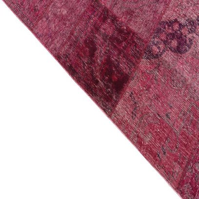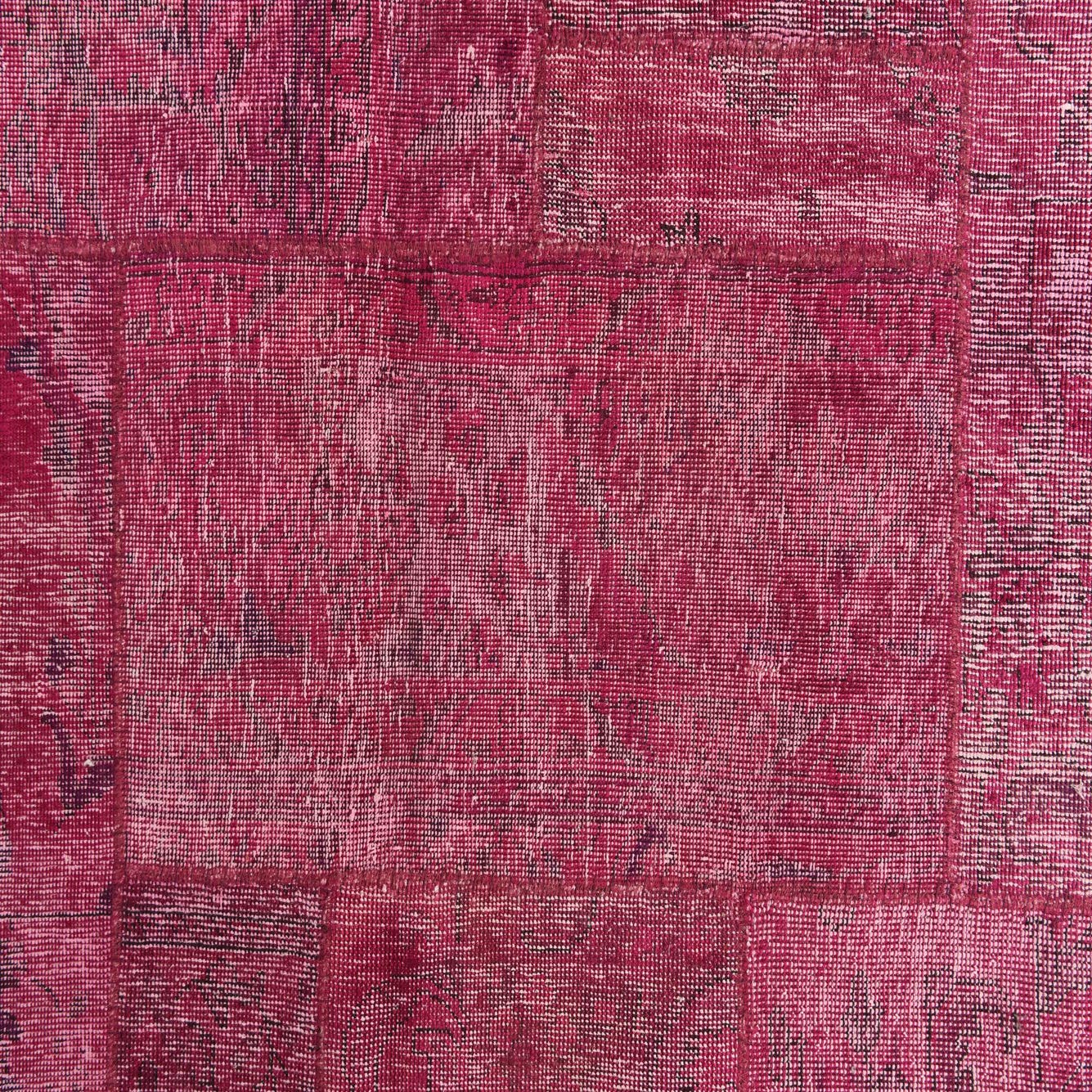 A 10x13 rectangular pink wool rug featuring a distressed patchwork design with varied shades of fuchsia and magenta, ideal for a living room.