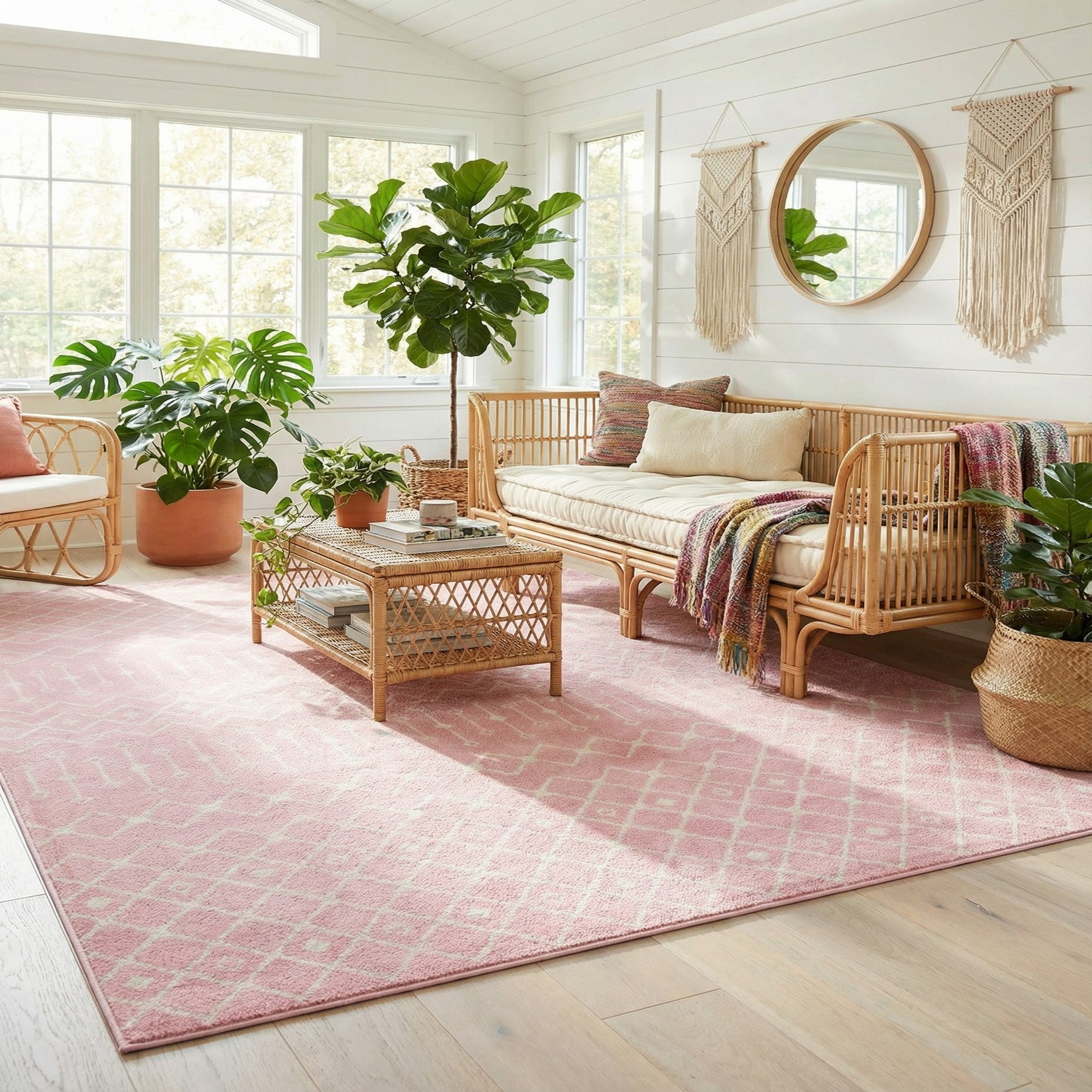 A soft pink field sets the stage for a delicate Moroccan trellis motif rendered in ivory. The pattern alternates diamond lattices and narrow linear motifs across the surface, creating a rhythmic, banded layout that feels both classic and contemporary. Machine-made from polypropylene, the rug has a low, even pile with a smooth, slightly plush hand; the ivory pattern is gently defined against the pink background for subtle depth and visual texture.