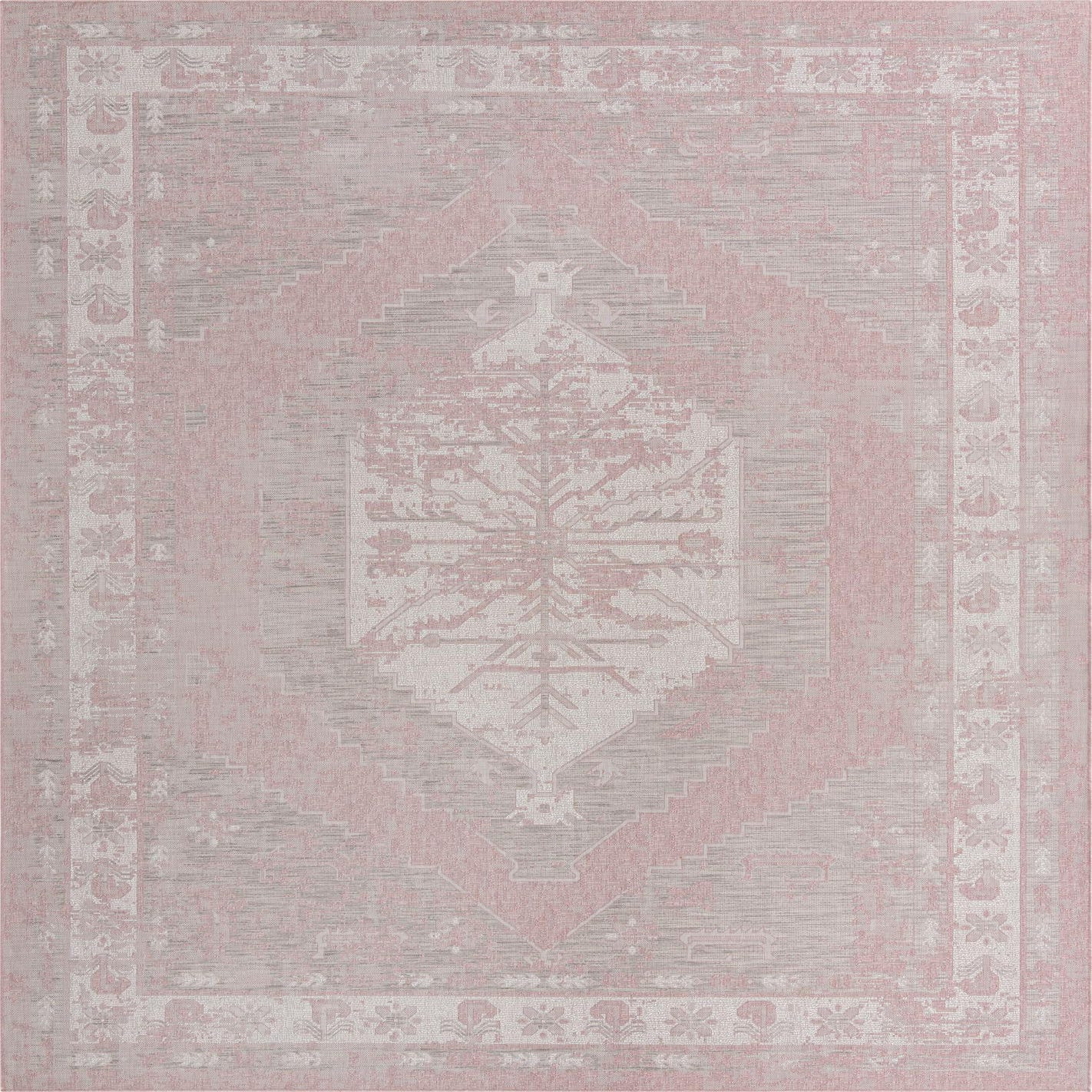 Machine-made from 100% polypropylene, the rug has a low-profile, tightly woven surface that feels smooth underfoot with a slight woven texture where the pattern lifts. It layers well in outdoor living areas, on covered patios and porches, or in indoor spaces that favor casual elegance — think sunrooms, breakfast nooks, feminine-inspired bedrooms, or a living room styled with light wood furniture and gray or cream upholstery. Pair it with wicker or painted furniture, soft brass accents, and linen textiles to highlight the pink and gray palette.