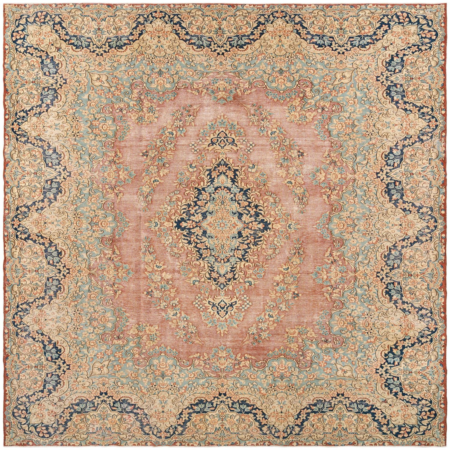 A 10x14 rectangular Vintage Royal wool rug featuring a distressed pink field with an intricate floral medallion and light blue, navy, and cream traditional patterns.