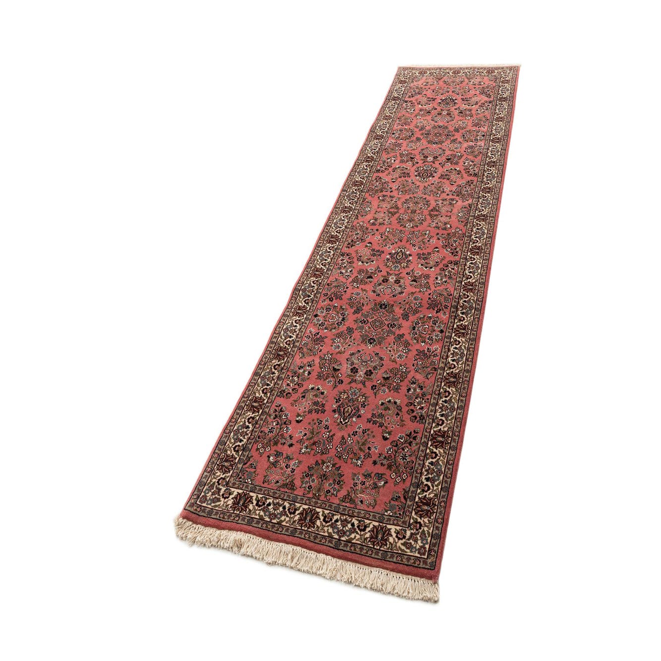 A pink 11 ft runner rug with an intricate oriental floral pattern and fringed ends, ideal for a hallway.
