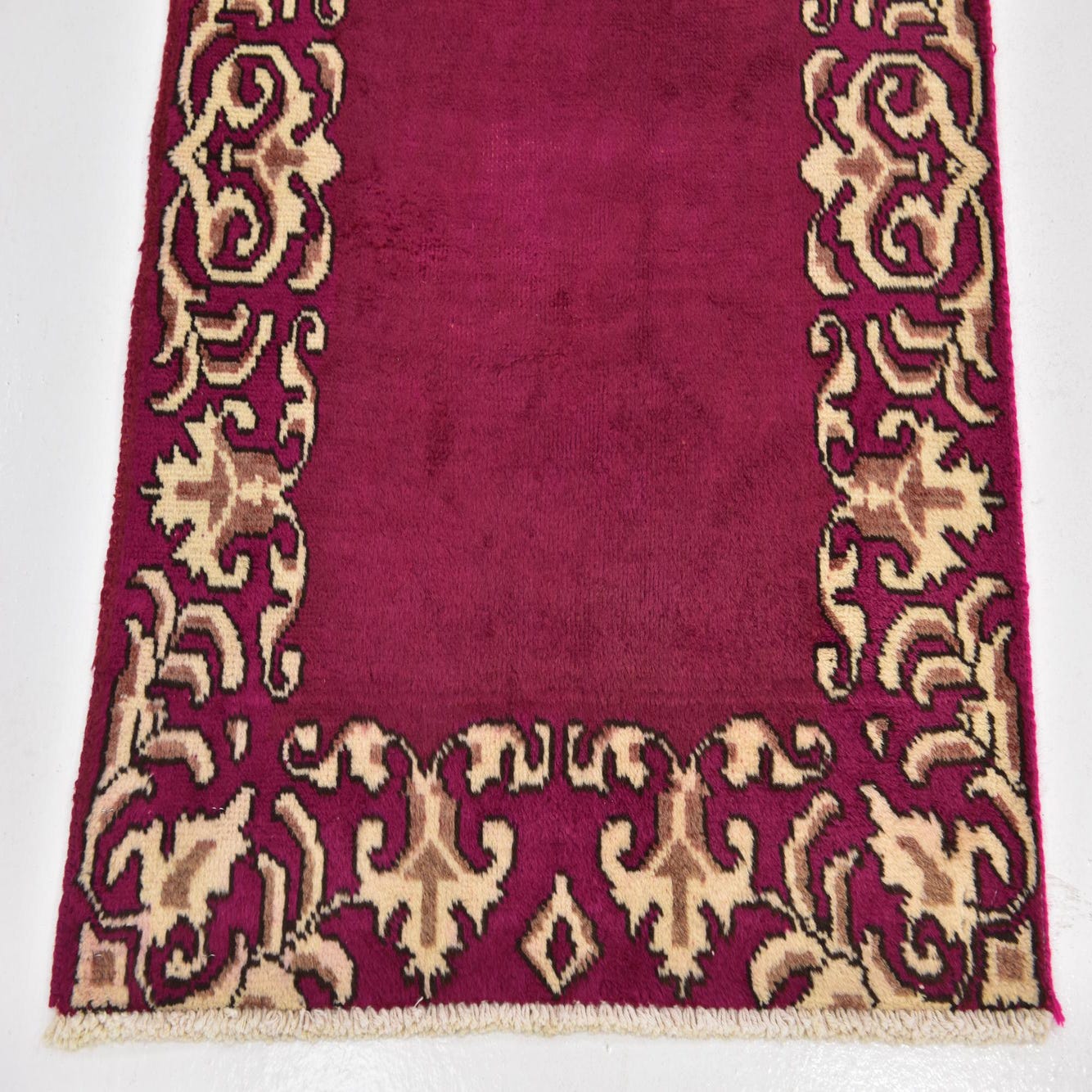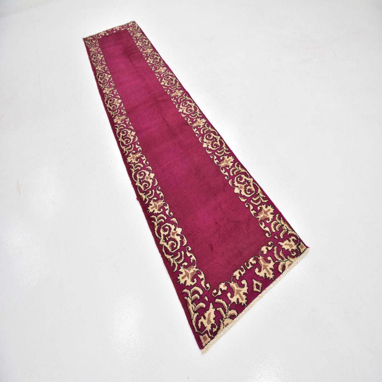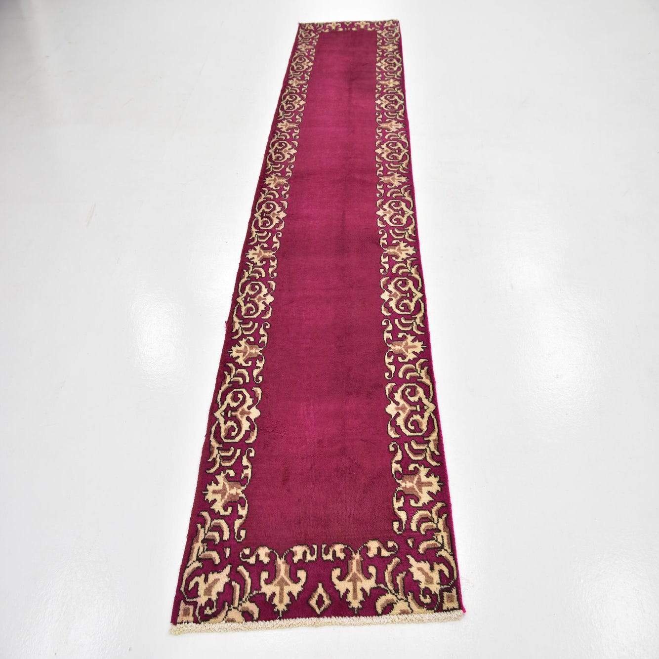 A long 11 ft runner rug in a rich pink hue, featuring an intricate traditional Persian border pattern in cream and brown.