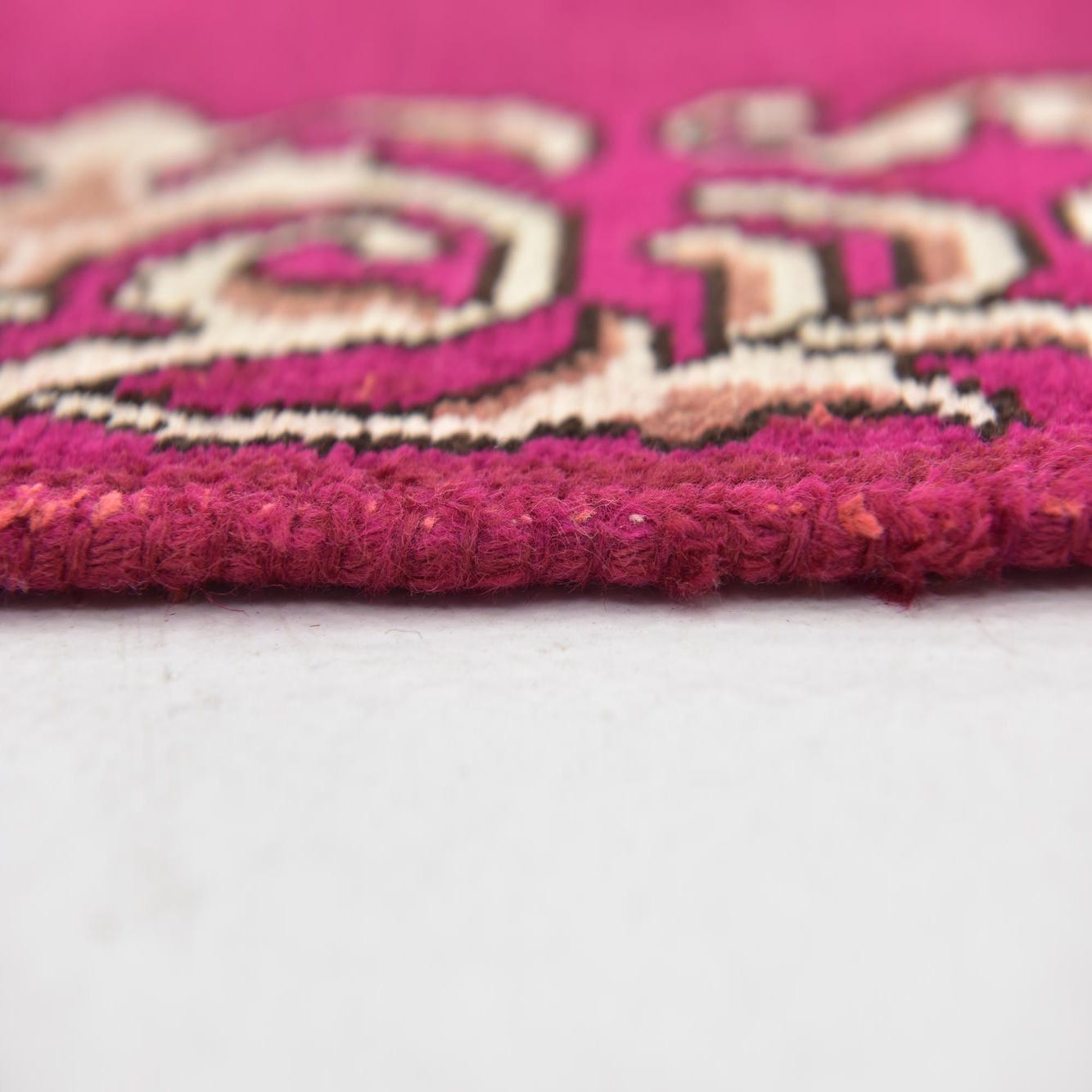 Primary color is Pink. Colors in this rug include: Pink, Ivory, Beige, Black.
