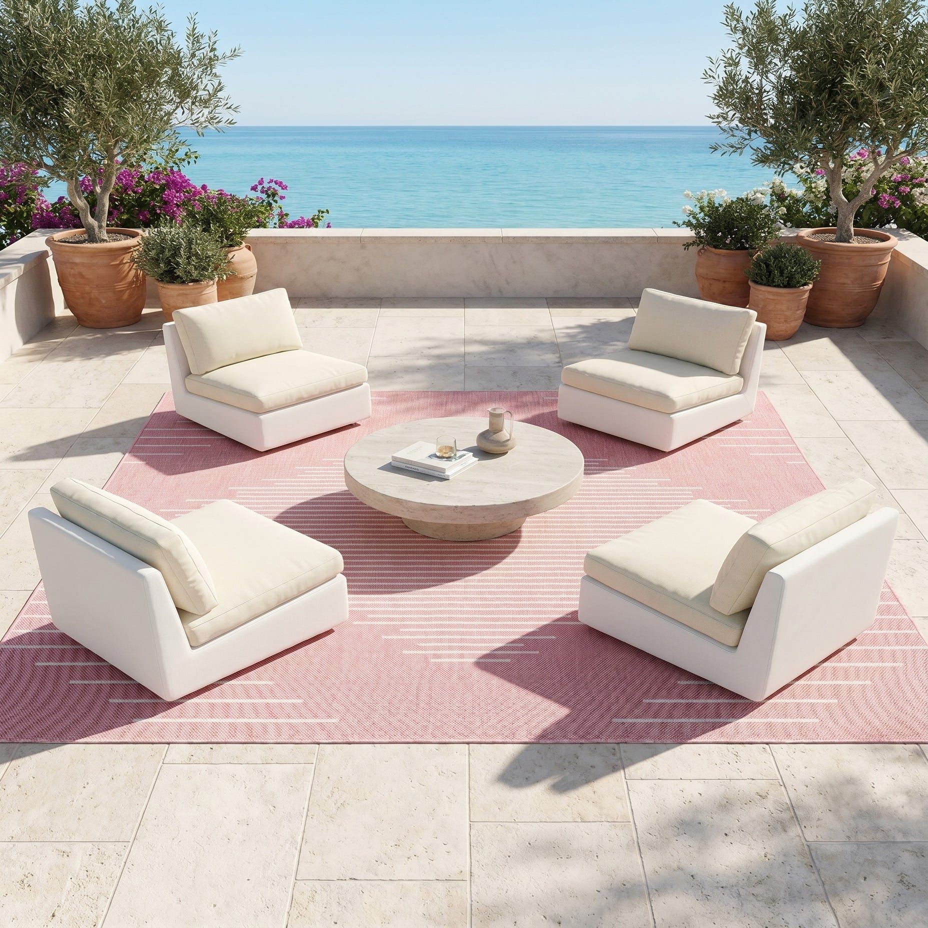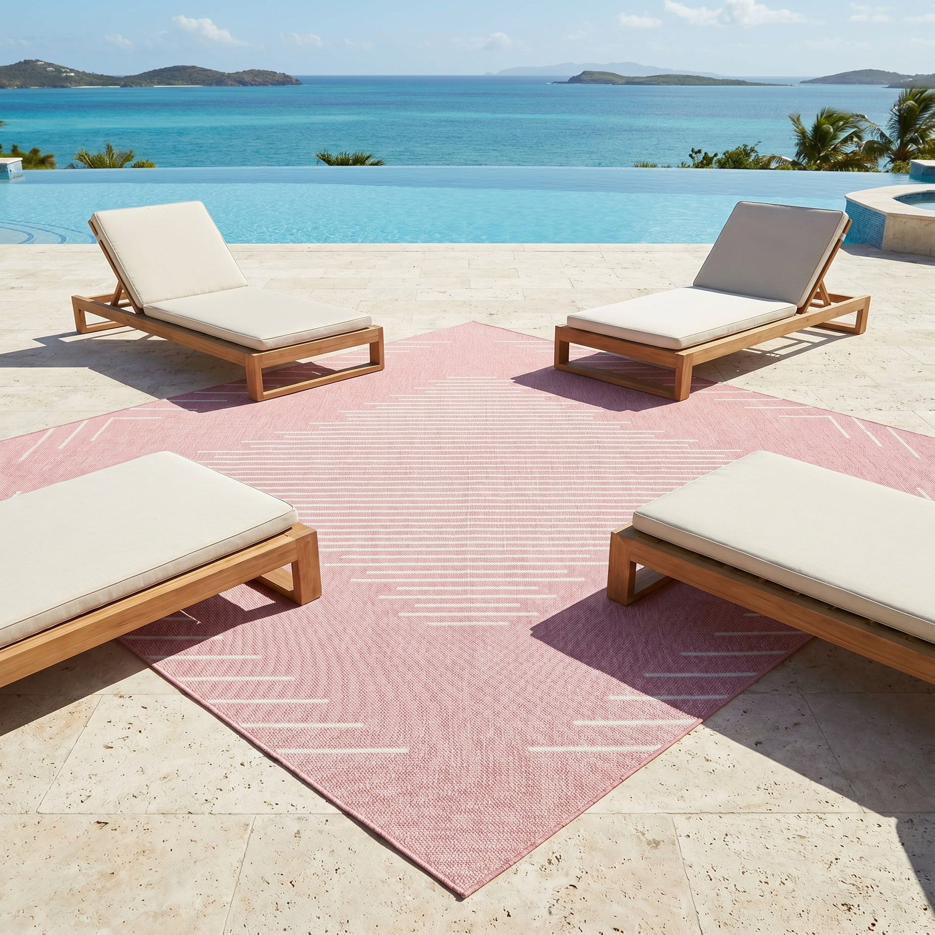 Love the contemporary look of this rug! We are so happy we chose this to accent the blue of our pool with our living area on our lanai. We still are going to add a few more pillows but love the rug to add color.