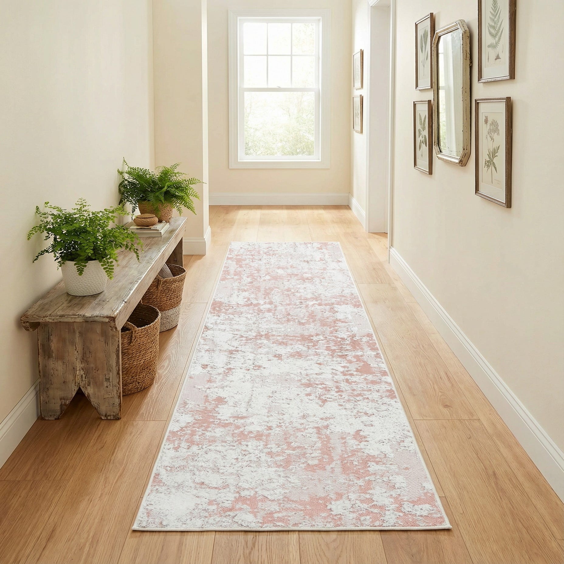 A 12 ft runner rug from the Rugs.com Abbey collection, featuring an abstract pattern in pinks and white, ideal for a hallway.