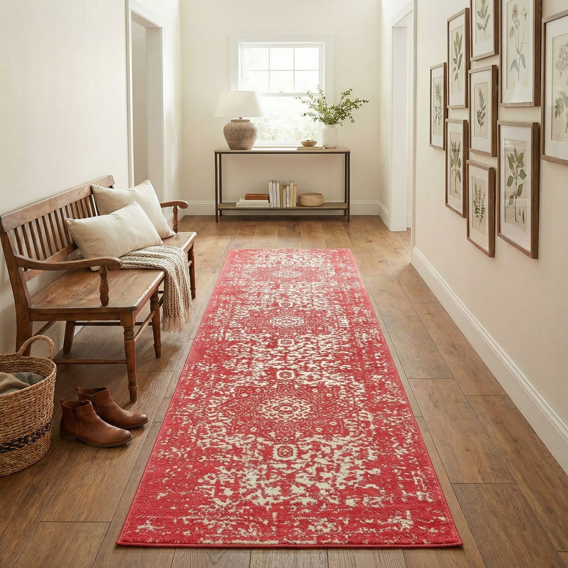 This runner works well in hallways and entryways where a bold color anchor is welcome, and it also pairs nicely along a kitchen or bedroom corridor to add warmth and pattern. Complement it with light woods and white or ivory upholstery for a fresh, modern look, or layer it into a bohemian or cottage scheme with woven baskets, brass accents, and soft textiles for a cozier palette.