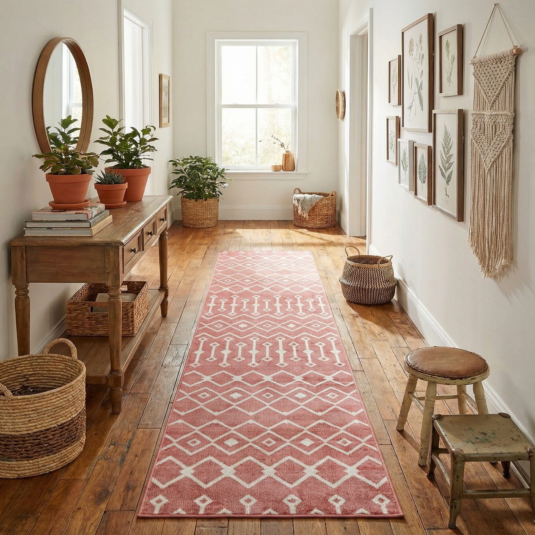 A warm pink ground supports a repeating boho trellis of diamonds and linear motifs in clean ivory, creating a rhythmic, geometric look that brings pattern without overwhelming a narrow space. The ivory lines are sharply defined against the pink background, and the alternating diamond and elongated shapes provide subtle movement along the length of the runner.