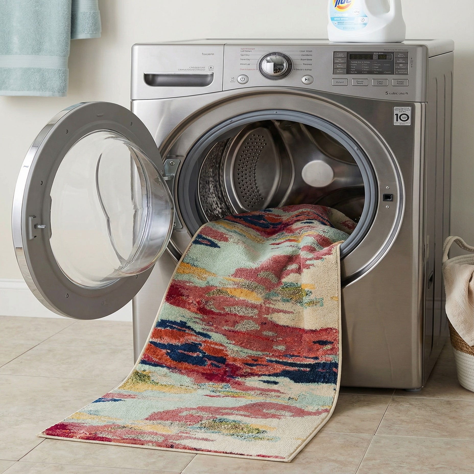 A lively abstract pattern sweeps across a soft pink ground, where painterly splashes of navy blue, green, orange, and yellow form irregular, cloud-like motifs. The contemporary design creates dynamic movement while maintaining a relaxed, artistic feel. Machine-made of 100% polypropylene, the surface has a short, dense pile that feels soft underfoot and a subtle sheen that enhances the depth of the colors.