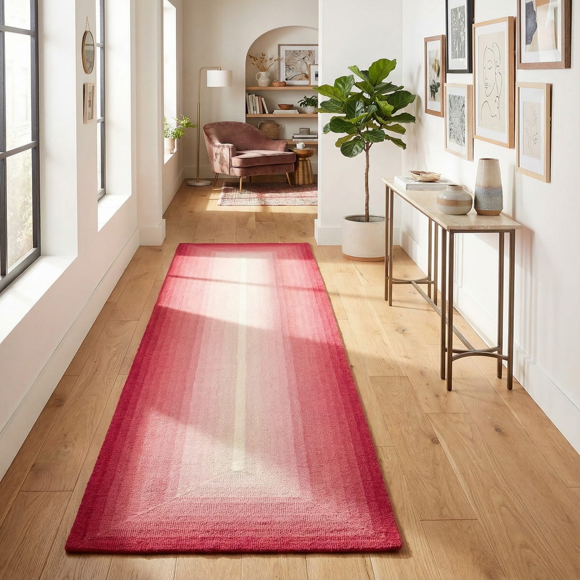 A 12 ft runner rug in shades of pink, featuring a modern ombre design that transitions from deep fuchsia to light blush, ideal for a hallway.