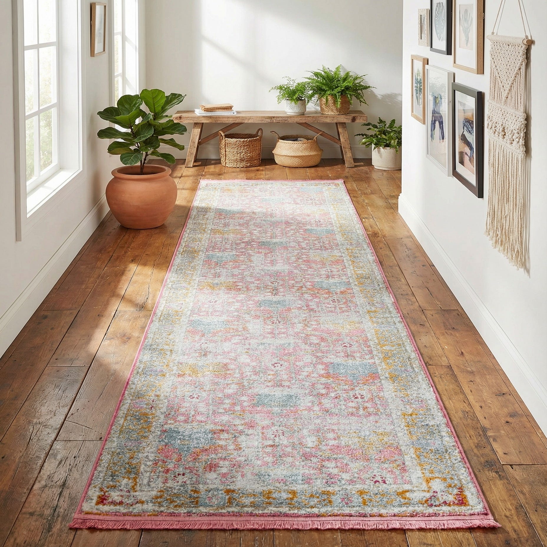 The Paragon collection presents an artful 12ft runner, machine-woven of 100% polypropylene for durability and longevity. This rug boasts a vivid, modern distressed pattern that combines an eclectic mix of colors, including pink, blue, gray, ivory, yellow, orange, and red, set against a pink background. The colors create a dynamic visual that could easily become the focal point of a space. Soft fringes on the short edges add a playful touch, enhancing the rug's overall appeal.