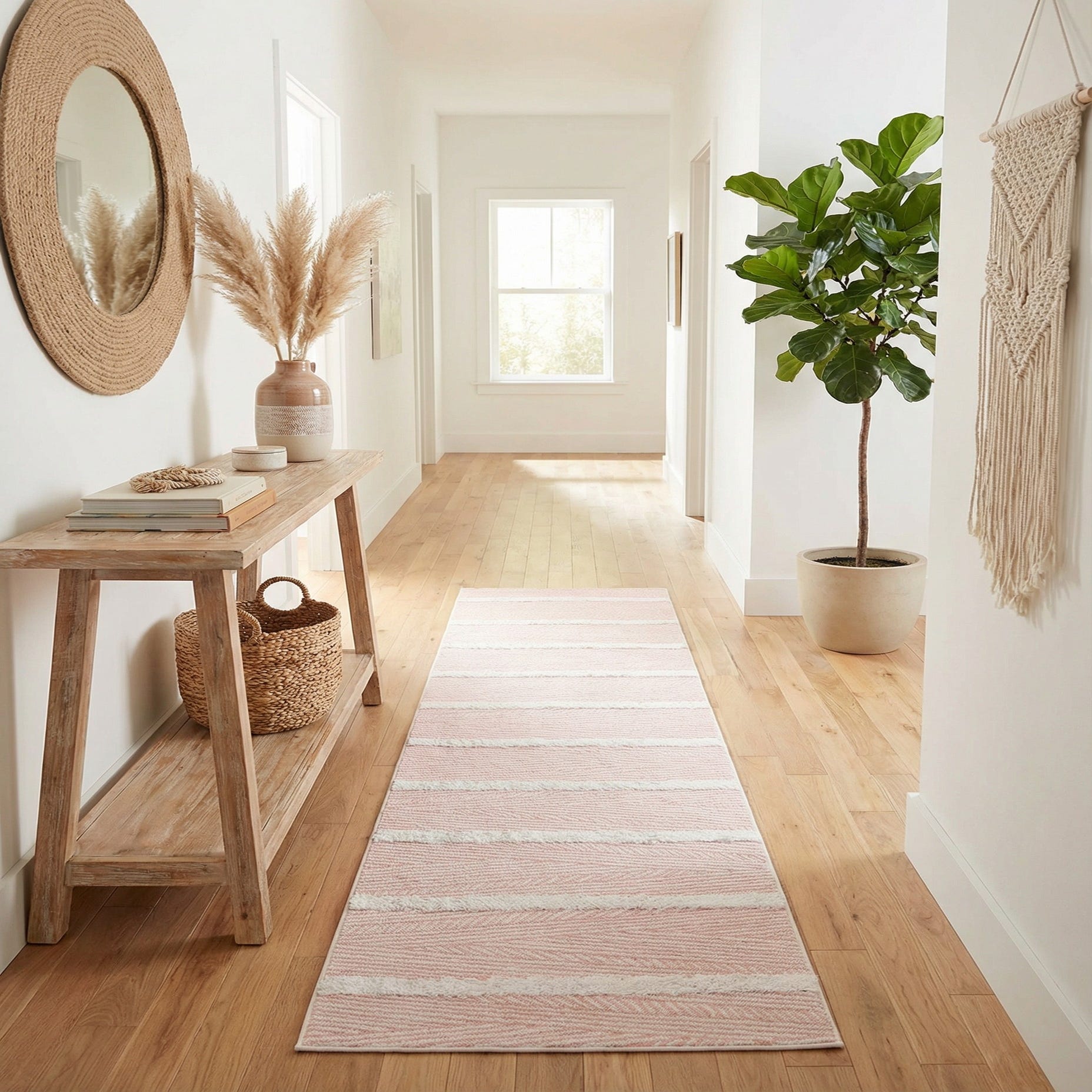 Machine made from 100% cotton, the surface feels soft and breathable underfoot while the raised ivory stripes add a bit of cushion and visual interest. Place it in a light-filled hallway or along a bedroom side to introduce a quiet, feminine touch; it also pairs well with Scandinavian, cottage, or modern coastal schemes. Combine with white or natural wood furniture, linen textiles, and brass or matte black accents for a balanced, lived-in feel.