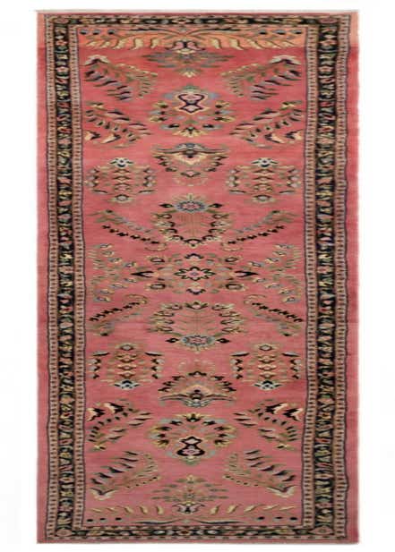 Primary color is Pink. Colors in this rug include: Pink, Blue.