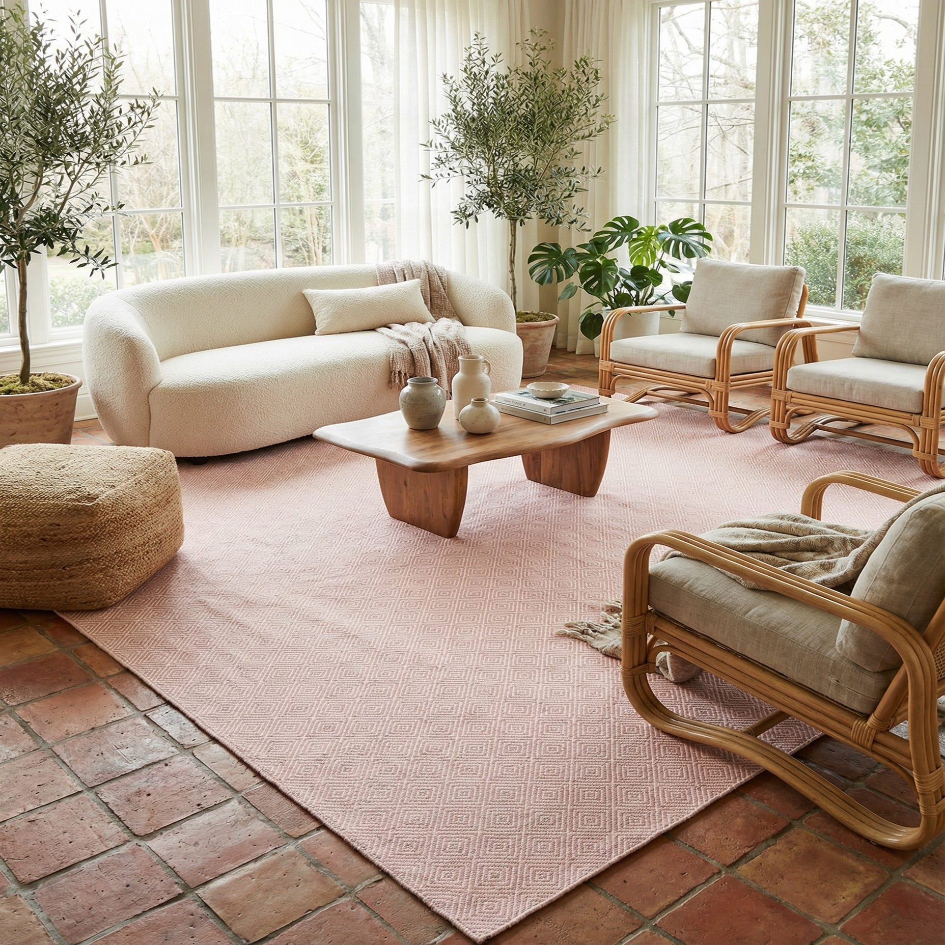 The Geo Trellis Flatweave rug is a handwoven statement piece, blending both form and function for the modern home. A tasteful palette of pink and ivory gives this 12-foot square rug a delicate charm, with the pink background offering a warm hue to any room. Its geometric trellis pattern provides a touch of sophistication, making it a versatile addition to various design aesthetics.