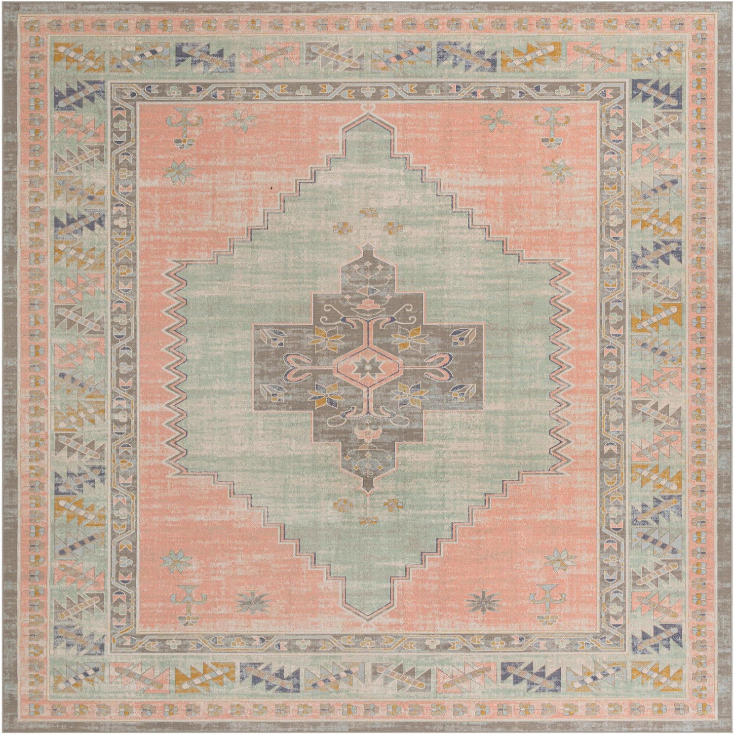 Primary color is Pink. Colors in this rug include: Pink, Blue, Gold, Gray, Light Blue, Light Green.