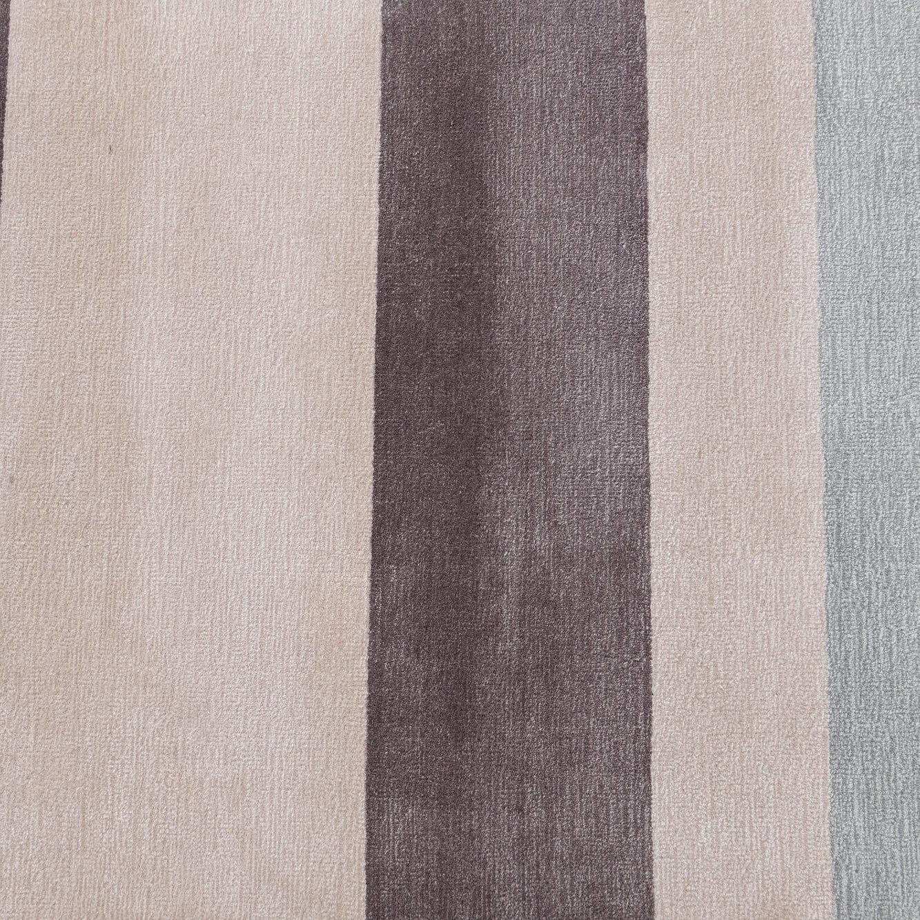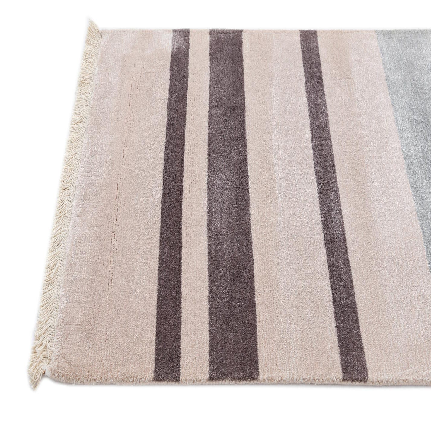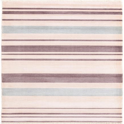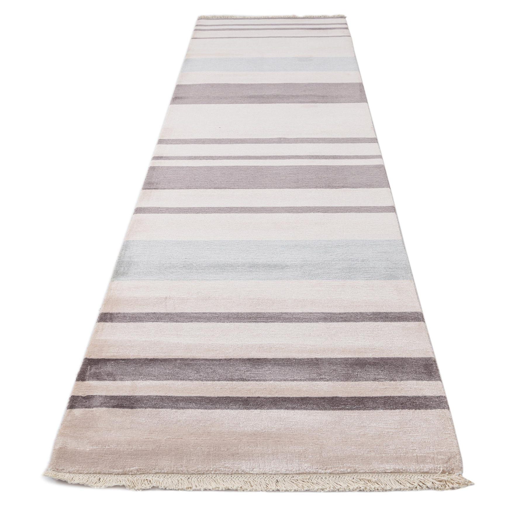 A 13 ft runner rug with horizontal stripes in varying shades of pink, purple, and light blue, perfect for a hallway.