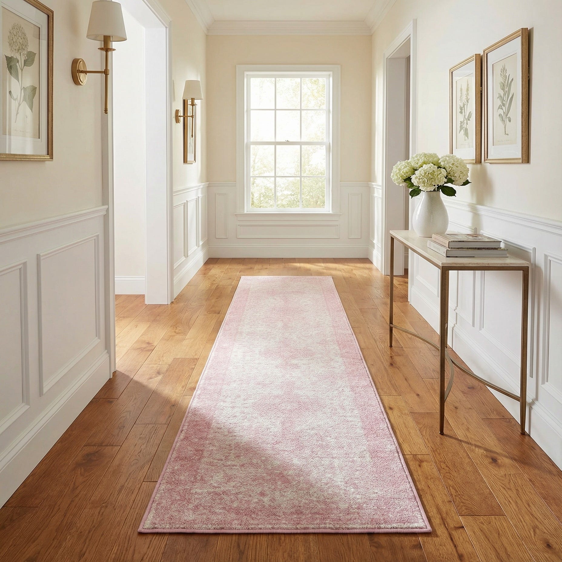 The pile has a low, smooth profile that feels soft underfoot while lying close to the floor, making it easy to layer with furniture and stair runners. This piece works well in a feminine bedroom or dressing area, a nursery or playroom where a gentle pop of color is welcome, or as a hallway or entry runner to add warmth without competing with other decor. It pairs nicely with light woods, white trim, and soft neutrals in cottage, coastal, Scandinavian, or modern transitional interiors.