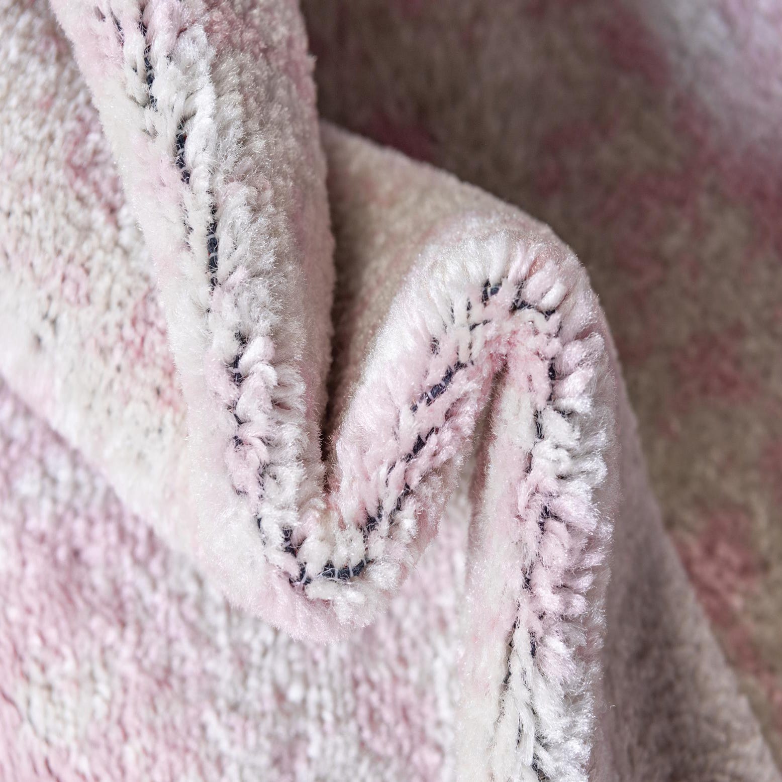 A soft pink field forms the backdrop for a low-contrast ivory medallion and border motif, worked in a subtly distressed, antique-inspired pattern. The design sits close to the surface, so the motif reads gently rather than boldly; running your hand across the pile you’d notice a smooth, low-profile texture with a slight plushness that feels comfortable underfoot. The muted pairing of pink and ivory gives the rug a fresh, feminine feel without overpowering a room.